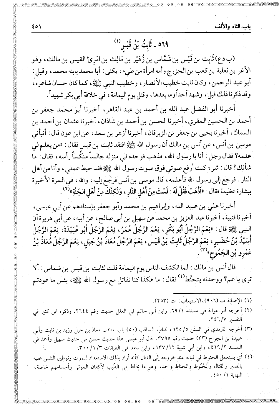 (١٧٢) أخبرنا عَلِيُّ بْنُ عُبَيْدِ اللَّهِ وَإِبْرَاهِيمُ بْنُ مُحَمَّدٍ وَأَبُو جَعْفَرٍ، بِإِسْنَادِهِمْ عن أَبِي عِيسَى، أخبرنا قُتَيْبَةُ، أخبرنا عَبْدُ الْعَزِيزِ بْنُ مُحَمَّدٍ، عن سُهَيْلِ بْنِ أَبِي صَالِحٍ، عن أَبِيهِ، عن أَبِي هُرَيْرَةَ، أَنَّ النَّبِيَّ صَلَّى اللَّهُ عَلَيْهِ وَسَلَّمَ قَالَ: نِعْمَ الرَّجُلُ أَبُو بَكْرٍ، نِعْمَ الرَّجُلُ عُمَرُ، نِعْمَ الرَّجُلُ أَبُو عُبَيْدَةَ، نِعْمَ الرَّجُلُ أُسَيْدُ بْنُ حُضَيْرٍ، نِعْمَ الرَّجُلُ ثَابِتُ بْنُ قَيْسٍ، نِعْمَ الرَّجُلُ مُعَاذُ بْنُ جَبَلٍ، نِعْمَ الرَّجُلُ مُعَاذُ بْنُ عَمْرِو بْنِ الْجَمُوحِ قال أنس بْن مالك: لما انكشف الناس يَوْم اليمامة قلت لثابت بْن قيس بْن شماس: ألا ترى يا عم؟ ووجدته يتحنط، فقال: ما هكذا كنا نقاتل مع رَسُول اللَّهِ صَلَّى اللَّهُ عَلَيْهِ وَسَلَّمَ بئس ما عودتم أقرانكم، وبئس ما عودتكم أنفسكم، اللهم إني أبرأ إليك مما جاء به هؤلاء، يعني: الكفار، وأبرأ إليك مما يصنع هؤلاء، يعني: المسلمين، ثم قاتل حتى قتل، بعد أن ثبت هو، وسالم مولى أَبِي حذيفة، فقاتلا حتى قتلا، وكان عَلَى ثابت درع له نفيسة، فمر به رجل من المسلمين فأخذها، فبينما رجل من المسلمين نائم أتاه ثابت في منامه، فقال له: إني أوصيك بوصية، فإياك أن تقول: هذا حلم، فتضيعه، إني لما قتلت أمس، مر بي رجل من المسلمين، فأخذ درعي، ومنزله في أقصى الناس، وعند خبائه فرس يستن في طوله، وقد كفأ عَلَى الدرع برمة، وفوق البرمة رحل، فَأْتِ خالدا، فمره فليبعث فليأخذها، فإذا قدمت المدينة عَلَى خليفة رَسُول اللَّهِ صَلَّى اللَّهُ عَلَيْهِ وَسَلَّمَ يعني: أبا بكر، فقل له: إن علي من الدين كذا وكذا، وفلان من رقيقي عتيق، وفلان، فاستيقظ الرجل، فأتى خالدًا فأخبره، فبعث إِلَى الدرع، فأتي بها عَلَى ما وصف، وحدث أبا بكر رضي اللَّه عنه برؤياه، فأجاز وصيته، ولا يعلم أحد أجيزت وصيته بعد موته سواء.