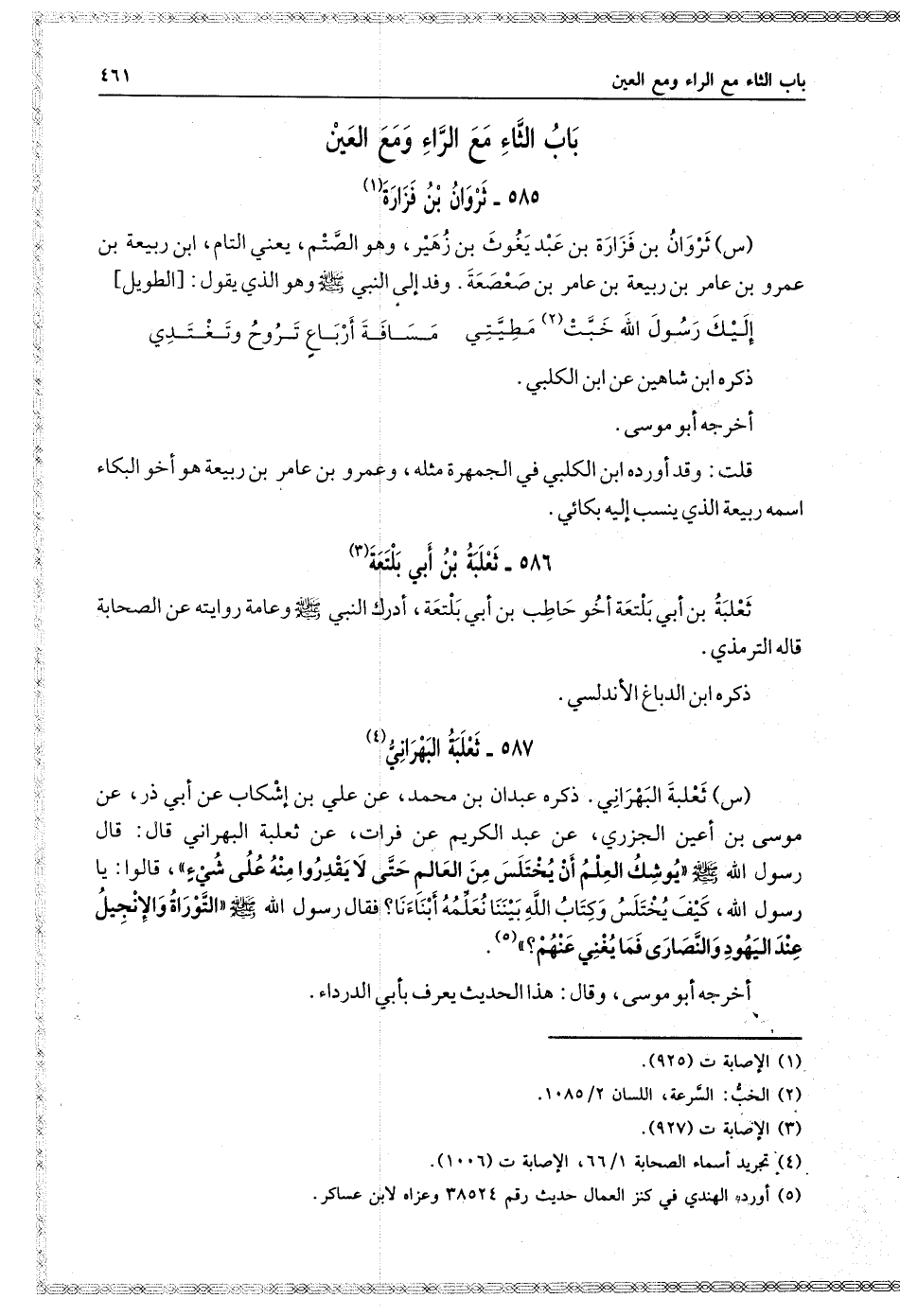 س: ثعلبة البهراني ذكره عبدان بْن مُحَمَّد، عن علي بْن إشكاب، عن أَبِي ذر، عن موسى بْن أعين الجزري، عن عبد الكريم، عن فرات، عن ثعلبة البهراني، قال: قال رَسُول اللَّهِ صَلَّى اللَّهُ عَلَيْهِ وَسَلَّمَ: يوشك العلم أن يختلس من العالم حتى لا يقدروا منه عَلَى شيء، قَالُوا: يا رَسُول اللَّهِ، كيف يختلس، وكتاب اللَّه بيننا نعلمه أبناءنا؟ فقال رَسُول اللَّهِ صَلَّى اللَّهُ عَلَيْهِ وَسَلَّمَ: التوراة والإنجيل عند اليهود والنصارى فما يغني عنهم.