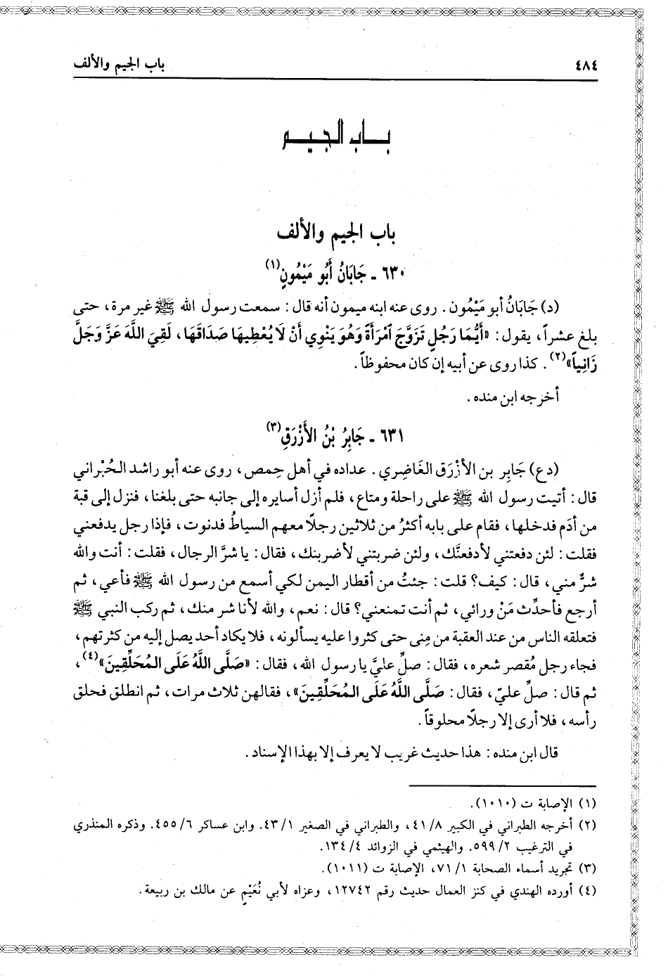 د ع: جابر بْن الأزرق الغاضري عداده في أهل حمص، روى عنه أَبُو راشد الحبراني، قال: أتيت رَسُول اللَّهِ صَلَّى اللَّهُ عَلَيْهِ وَسَلَّمَ عَلَى راحلة ومتاع، فلم أزل أسايره إِلَى جانبه حتى بلغنا، فنزل إِلَى قبة من أدم فدخلها، فقام عَلَى بابه أكثر من ثلاثين رجلا معهم السياط فدنوت، فإذا رجل يدفعني، فقلت: لئن دفعتني لأدفعنك، ولئن ضربتني لأضربنك، فقال: يا شر الرجال، فقلت: أنت والله شر مني، قال: كيف؟ قلت: جئت من أقطار اليمن لكي أسمع من رَسُول اللَّهِ صَلَّى اللَّهُ عَلَيْهِ وَسَلَّمَ فأعي، ثم أرجع فأحدث من ورائي، ثم أنت تمنعني؟ قال: نعم، والله لأنا شر منك، ثم ركب النَّبِيّ صَلَّى اللَّهُ عَلَيْهِ وَسَلَّمَ فتعلقه الناس من عند العقبة من منى حتى كثروا عليه يسألونه، فلا يكاد أحد يصل إليه من كثرتهم، فجاء رجل مقصر شعره، فقال: صل علي يا رَسُول اللَّهِ، فقال: صلى اللَّه عَلَى المحلقين، ثم قال: صل علي، فقال: صلى اللَّه عَلَى المحلقين، فقالهن ثلاث مرات، ثم انطلق فحلق رأسه، فلا أرى إلا رجلا محلوقا.