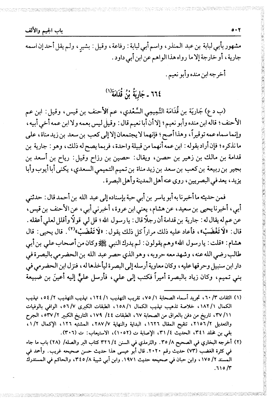 (١٩٦) أخبرنا بِهِ أَبُو يَاسِرِ بْنُ أَبِي حَبَّةَ، بِإِسْنَادِهِ إِلَى عَبْدِ اللَّهِ بْنِ أَحْمَدَ، قَالَ: حَدَّثَنِي أَبِي، أخبرنا يَحْيَى بْنُ سَعِيدٍ، عن هِشَامٍ يعَنْيِ ابْنَ عُرْوَةَ، أَخْبَرَنِي أَبِي، عن الأَحْنَفِ بْنِ قَيْسٍ، عن عَمٍّ لَهُ يُقَالُ لَهُ: جَارِيَةُ بْنُ قُدَامَةَ، أَنَّ رَجُلا قَالَ: يَا رَسُولَ اللَّهِ، قُلْ لِي قَوْلا وَأَقْلِلْ لِعَلِيٍّ أَعْقِلُهُ، قَالَ: لَا تَغْضَبْ، فَأَعَادَ عَلَيْهِ ذَلِكَ مِرَارًا كُلُّ ذَلِكَ يَقُولُ: لا تَغْضَبْ، قَالَ يَحْيَى: قَالَ هِشَامٌ: قُلْتُ: يَا رَسُولَ اللَّهِ، وَهُمْ يَقُولُونَ: لَمْ يُدْرِكِ النَّبِيَّ صَلَّى اللَّهُ عَلَيْهِ وَسَلَّمَ وَكَانَ مِنْ أَصْحَابِ عَلِيِّ بْنِ أَبِي طَالِبٍ رَضِيَ اللَّهُ عَنْهُ، وَشَهِدَ مَعَهُ حُرُوبَهُ وهو الذي حصر عَبْد اللَّهِ بْن الحضرمي بالبصرة في دار ابن سنبيل، وحرقها عليه، وكان معاوية أرسله إِلَى البصرة ليأخذها له، فنزل ابن الحضرمي في بني تميم، وكان زياد بالبصرة أميرًا، فكتب إِلَى علي، فأرسل علي إليه أعين بْن ضبيعة المجاشي، فقتل غيلة، فبعث علي بعده جارية بْن قدامة، فأحرق عَلَى ابن الحضرمي الدار التي سكنها.