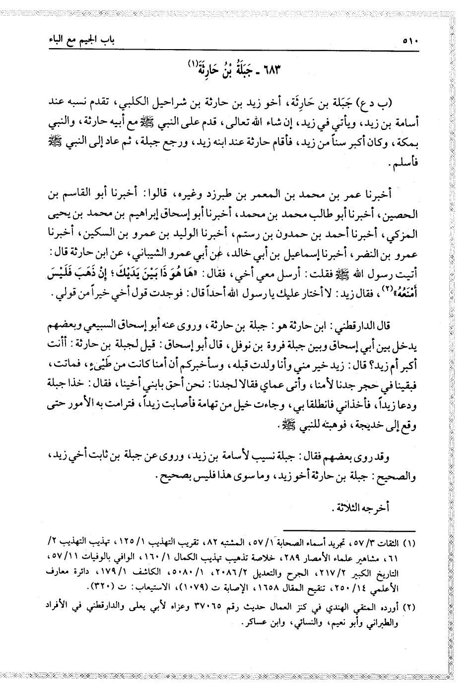 قال أَبُو إِسْحَاقَ: قيل لجبلة بْن حارثة: أأنت أكبر أم زيد؟ قال: زيد خير مني، وأنا ولدت قبله، وسأخبركم أن أمنا كانت من طَيِّءَ، فماتت، فبقينا في حجر جدنا لأمنا، وأتى عماي فقالا لجدنا: نحن أحق بابني أخينا، فقال: خذا جبلة، ودعا زيدًا، فأخذاني فانطلقا بي، وجاءت خيل من تهامة فأصابت زيدًا، فترامت به الأمول حتى وقع إِلَى خديجة، فوهبته للنبي صَلَّى اللَّهُ عَلَيْهِ وَسَلَّمَ روى بعضهم، فقال: جبلة نسيب لأسامة بْن زيد.