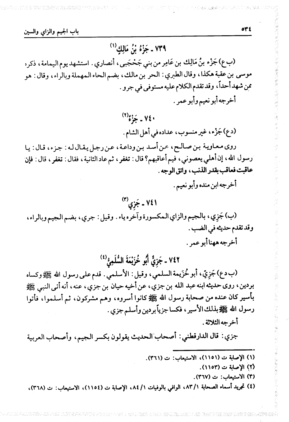 جزي: قال الدارقطني: أصحاب الحديث يقولون: بكسر الجيم، وأصحاب العربية يقولون: بعد الجيم المفتوحة زاي وهمزة، وقال عبد الغني: جزي بفتح الجيم، وكسر الزاي، وقيل: بكسر الجيم، وسكون الزاي، وبالجملة فهذه الأسماء كلها قد اختلف العلماء فيها اختلافا كثيرًا عَلَى ما ذكرناه.