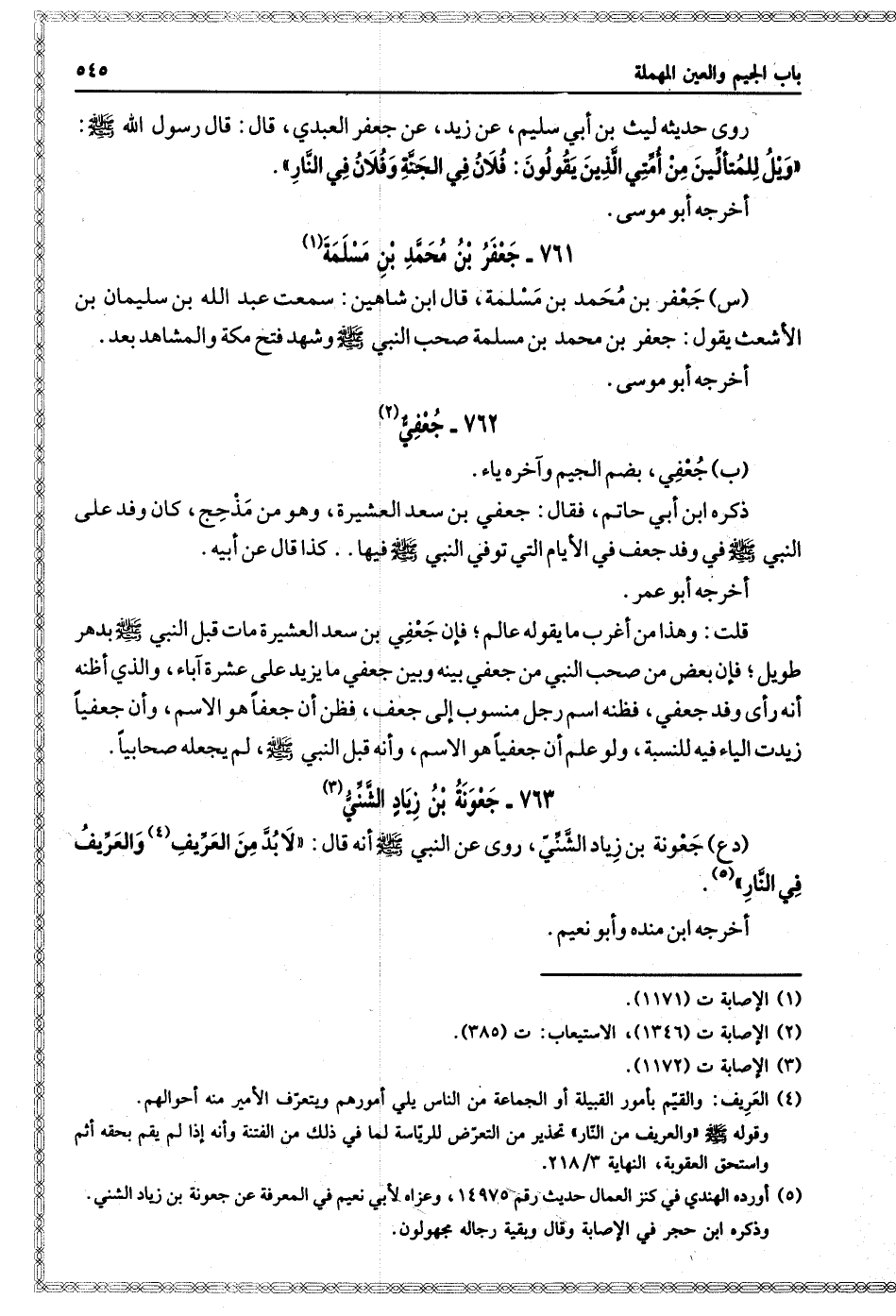 قلت: وهذا من أغرب ما يقوله عالم، فإن جعفي بْن سعد العشيرة مات قبل النَّبِيّ صَلَّى اللَّهُ عَلَيْهِ وَسَلَّمَ بدهر طويل، فإن بعض من صحب النَّبِيّ صَلَّى اللَّهُ عَلَيْهِ وَسَلَّمَ من جعفي بينه وبين جعفي ما يزيد عَلَى عشرة آباء، والذي أظنه أَنَّهُ رَأَى وفد جعفي، فظنه اسم رجل منسوب إِلَى جعف، فظن أن جعفًا هو الاسم، وأن جعفيًا زيدت الياء فيه للنسبة، ولو علم أن جعفيًا هو الاسم، وأنه قبل النَّبِيّ صَلَّى اللَّهُ عَلَيْهِ وَسَلَّمَ لم يجعله صحابيًا.
