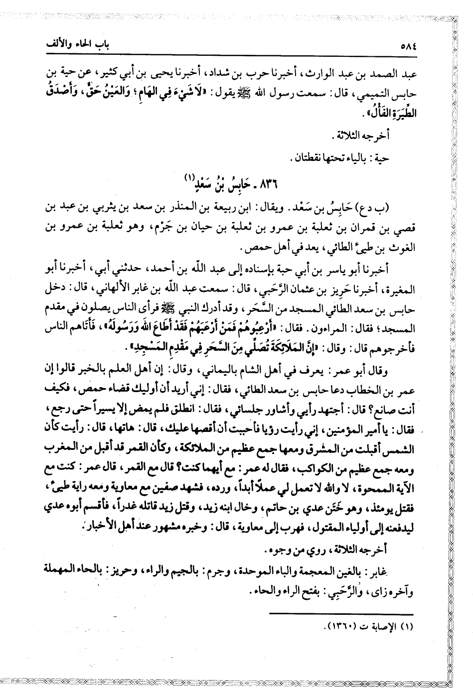 (٢٤١) أخبرنا أَبُو يَاسِرِ بْنُ أَبِي حَبَّةَ، بِإِسْنَادِهِ إِلَى عَبْدِ اللَّهِ بْنِ أَحْمَدَ، حَدَّثَنِي أَبِي، أخبرنا أَبُو الْمُغِيرَةِ، أخبرنا حَرِيزُ بْنُ عُثْمَانَ الرَّحْبِيُّ، قَالَ: سَمِعْتُ عَبْدَ اللَّهِ بْنَ غَابِرٍ الْأَلْهَانِيَّ، قَالَ: دَخَلَ حَابِسُ بْنُ سَعْدٍ الطَّائِيُّ الْمَسْجِدَ مِنَ السَّحَرِ، وَقَدْ أَدْرَكَ النَّبِيَّ صَلَّى اللَّهُ عَلَيْهِ وَسَلَّمَ فَرَأَى النَّاسَ يُصَلُّونَ فِي مُقَدَّمِ الْمَسْجِدِ، فَقَالَ: الْمُرَاءُونَ، فَقَالَ: أَرْعِبُوهُمْ فَمَنْ أَرْعَبَهُمْ فَقَدْ أَطَاعَ اللَّهَ وَرَسُولَهُ، فَأَتَاهُمُ النَّاسُ فَأَخْرَجُوهُمْ، قَالَ: وَقَالَ: إِنَّ الْمَلائِكَةَ تُصَلِّي مِنَ السَّحَرِ فِي مُقَدَّمِ الْمَسْجِدِ وَقَالَ أَبُو عُمَرَ: يُعْرَفِ فِي أَهْلِ الشَّامِ بِالْيَمَانِيِّ، وَقَالَ: إِنَّ أَهْلَ الْعِلْمِ بِالْخَبَرِ، قَالُوا: إِنَّ عُمَرَ بْنَ الْخَطَّابِ دَعَا حَابِسَ بْنَ سَعْدٍ الطَّائِيَّ، فَقَالَ: إِنِّي أُرِيدُ أَنْ أُوَلِّيَكَ قَضَاءَ حِمْصَ، فَكَيْفَ أَنْتَ صَانِعٌ؟ قَالَ: أَجْتَهِدُ رَأْيِي، وَأُشَاوِرُ جُلَسَائِي، فَقَالَ: انْطَلِقْ فَلَمْ يَمْضِ إِلا يَسِيرًا حَتَّى رَجَعَ، فَقَالَ: يَا أَمِيرَ الْمُؤْمِنِينَ، إِنِّي رَأَيْتُ رُؤْيَا، فَأَحْبَبْتُ أَنْ أَقُصَّهَا عَلَيْكَ، قَالَ: هَاتِهَا، وَقَالَ: رَأَيْتُ كَأَنَّ الشَّمْسَ أَقْبَلَتْ مِنَ الْمَشْرِقِ، وَمَعَهَا جَمْعٌ عَظِيمٌ مِنَ الْمَلائِكَةِ، وَكَأَنَّ الْقَمَرَ قَدْ أَقْبَلَ مِنَ الْمَغْرِبِ وَمَعَهُ جَمْعٌ عَظِيمٌ مِنَ الْكَوَاكِبِ، فَقَالَ لَهُ عُمَرُ: مَعَ أَيُّهُمَا كُنْتَ؟ قَالَ: مَعَ الْقَمَرِ، قَالَ عُمَرُ: كُنْتَ مَعَ الآيَةِ الْمَمْحُوَّةِ، لا وَاللَّهِ لا تَعْمَلَ لِي عَمَلا أَبَدًا، وَرَدَّهُ، فَشَهِدَ صِفِّينَ مَعَ مُعَاوِيَةَ، وَمَعَهُ رَايَةُ طَيِّءَ، فَقُتِلَ يَوْمَئِذٍ، وَهُوَ خَتْنُ عَدِيِّ بْنِ حَاتِمٍ، وَخَالُ ابْنِهِ زَيْدٍ، وَقُتِلَ زَيْدٌ قَاتَلَهُ غَدْرًا، فَأَقْسَمَ أَبُوهُ عَدِيٌّ لِيَدْفَعَنَّهُ إِلَى أَوْلِيَاءِ الْمَقْتُولِ، فَهَرَبَ إِلَى مُعَاوِيَةَ، قَالَ: وَخَبَرُهُ مَشْهُورٌ عِنْدَ أَهْلِ الأَخْبَارِ.