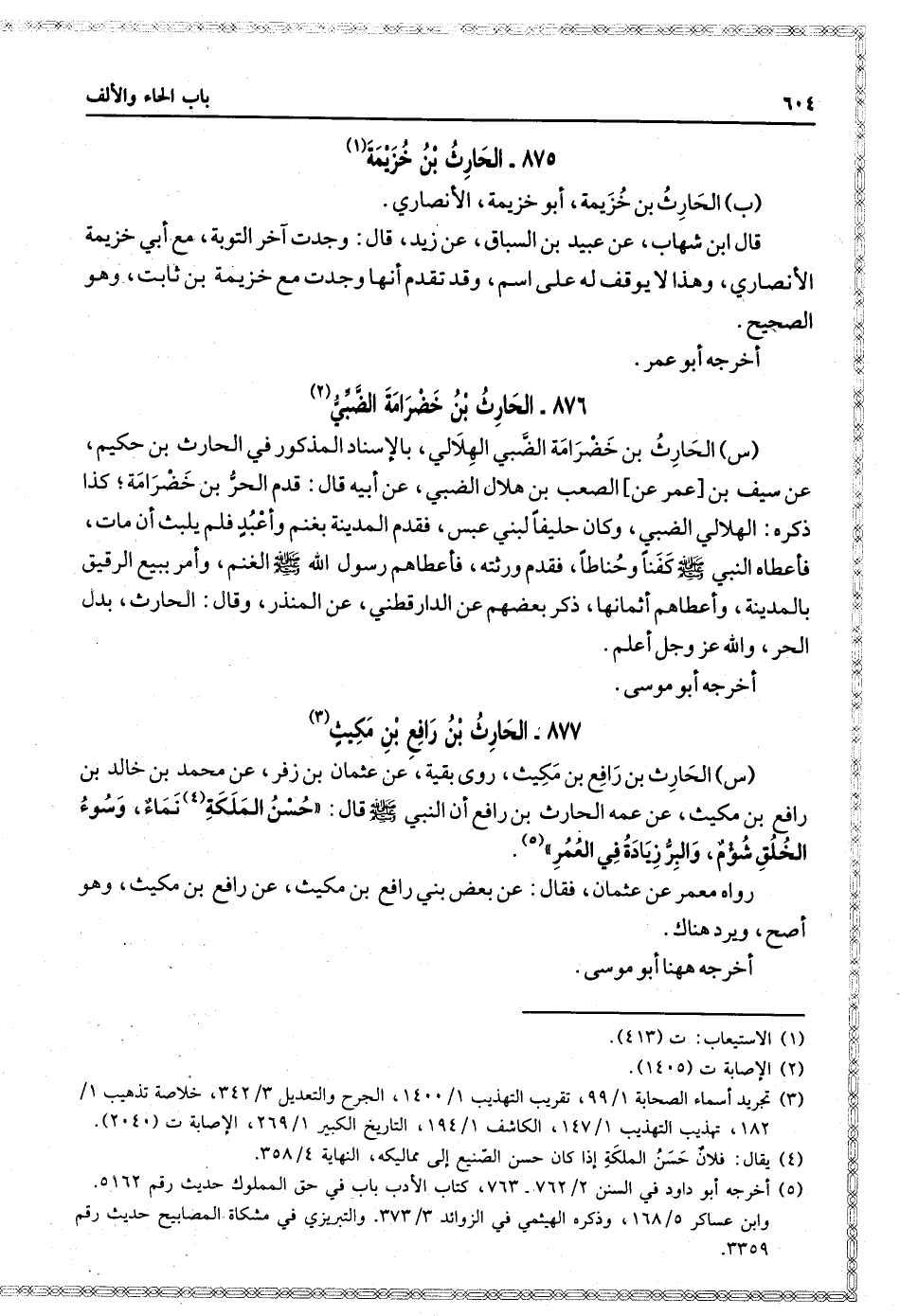 س: الحارث بْن رافع بْن مكيث روى بقية، عن عثمان بْن زفر، عن مُحَمَّدِ بْنِ خَالِد بْن رافع بْن مكيث، عن عمه الحارث بْن رافع، أن النَّبِيّ صَلَّى اللَّهُ عَلَيْهِ وَسَلَّمَ قال: حسن الملكة نماء، وسوء الخلق شؤم، والبر زيادة في العمر.