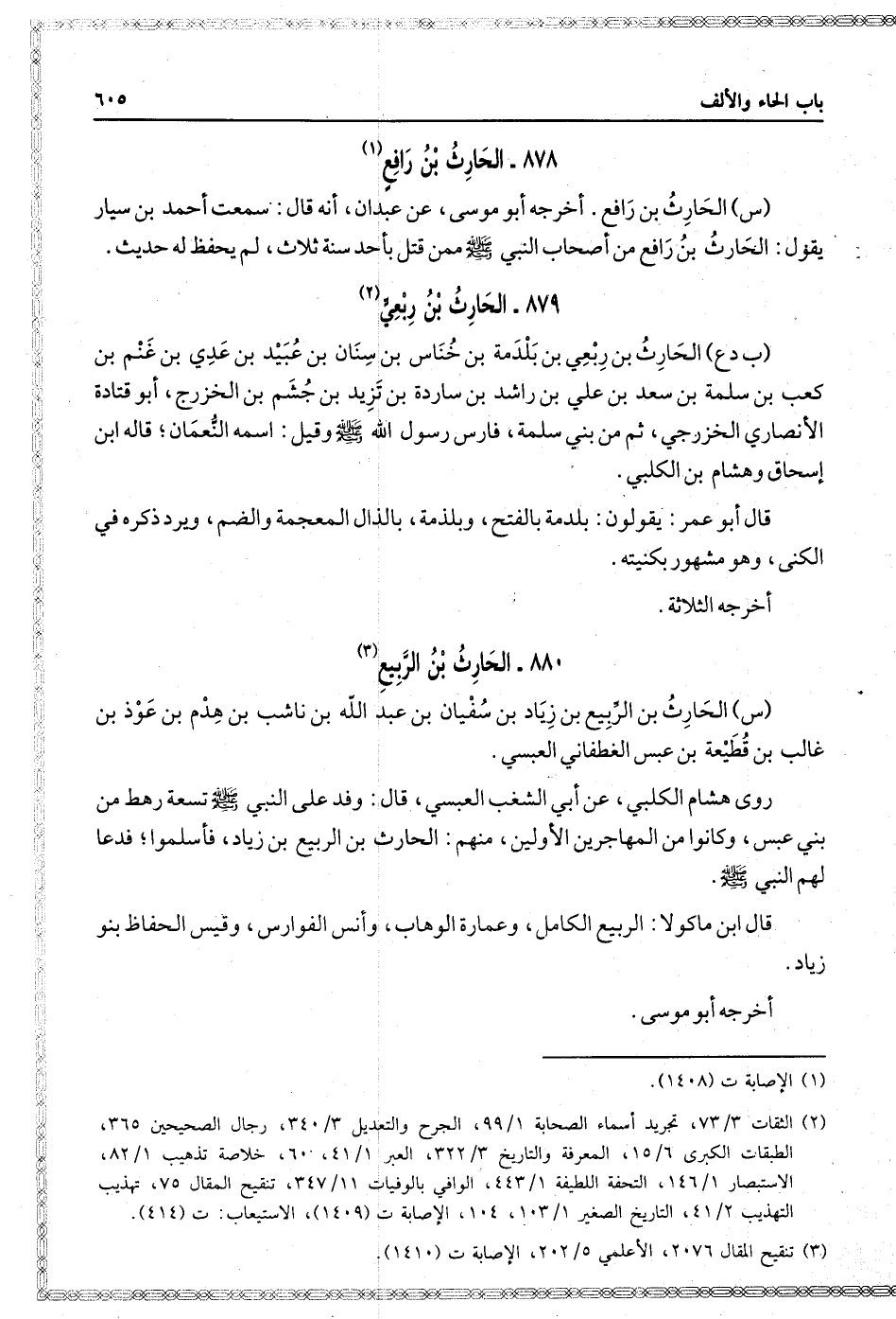 س: الحارث بْن رافع أخرجه أَبُو موسى، عن عبدان، أَنَّهُ قال: سمعت أحمد بْن سيار يقول: الحارث بْن رافع من أصحاب النَّبِيّ صَلَّى اللَّهُ عَلَيْهِ وَسَلَّمَ ممن قتل بأحد سنة ثلاث، لم يحفظ له حديث.