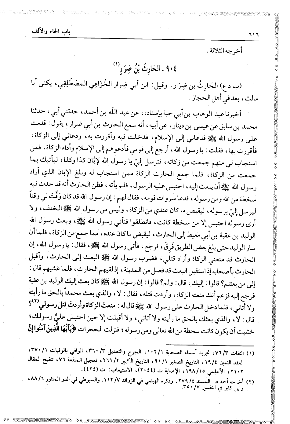 (٢٥٣) أخبرنا عَبْدُ الْوَهَّابِ بْنُ أَبِي حَبَّةَ، بِإِسْنَادِهِ عن عَبْدِ اللَّهِ بْنِ أَحْمَدَ، حَدَّثَنِي أَبِي، حدثنا مُحَمَّدُ بْنُ سَابِقٍ، عن عِيسَى بْنِ دِينَارٍ، عن أَبِيهِ، أَنَّهُ سَمِعَ الْحَارِثَ بْنَ أَبِي ضِرَارٍ، يَقُولُ: قَدِمْتُ عَلَى رَسُولِ اللَّهِ صَلَّى اللَّهُ عَلَيْهِ وَسَلَّمَ فَدَعَانِي إِلَى الإِسْلامِ، فَدَخَلْتُ فِيهِ، وَأَقْرَرْتُ بِهِ، وَدَعَانِي إِلَى الزَّكَاةِ، فَأَقْرَرْتُ بِهَا، فَقُلْتُ: يَا رَسُولَ اللَّهِ، أَرْجِعُ إِلَى قَوْمِي، فَأَدْعُوهُمْ إِلَى الإِسْلامِ، وَأَدَاءِ الزَّكَاةِ، فَمَنِ اسْتَجَابَ لِي مِنْهُمْ جَمَعْتُ زَكَاتَهُ، فَتُرْسِلُ إِلَيَّ يَا رَسُولَ اللَّهِ لإِبَّانِ كَذَا وَكَذَا، لِيَأْتِيكَ بِمَا جَمَعْتُ مِنَ الزَّكَاةِ، فَلَمَّا جَمَعَ الْحَارِثُ الزَّكَاةَ مِمَّنِ اسْتَجَابَ لَهُ، وَبَلَغَ الإِبَّانَ الَّذِي أَرَادَ رَسُولُ اللَّهِ صَلَّى اللَّهُ عَلَيْهِ وَسَلَّمَ أَنْ يَبْعَثَ إِلَيْهِ، احْتَبَسَ عَلَيْهِ الرَّسُولُ، فَلَمْ يَأْتِهِ، فَظَنَّ الْحَارِثُ أَنَّهُ قَدْ حَدَثَ فِيهِ سَخْطَةٌ مِنَ اللَّهِ وَمِنْ رَسُولِهِ، فَدَعَا سَرَوَاتَ قَوْمِهِ، فَقَالَ لَهُمْ: إِنَّ رَسُولَ اللَّهِ قَدْ كَانَ وَقَّتَ لِي وَقْتًا لِيُرْسِلُ إِلَيَّ بِرَسُولِهِ، لِيَقْبِضَ مَا كَانَ عِنْدِي مِنَ الزَّكَاةِ، وَلَيْسَ مِنْ رَسُولِ اللَّهِ صَلَّى اللَّهُ عَلَيْهِ وَسَلَّمَ الْخُلْفُ، وَلا أَرَى رَسُولَهُ احْتَبَسَ إِلا مِنْ سَخْطَةٍ كَانَتْ، فَانْطَلِقُوا فَنَأْتِي رَسُولَ اللَّهِ صَلَّى اللَّهُ عَلَيْهِ وَسَلَّمَ وَبَعَثَ رَسُولُ اللَّهِ الْوَلِيدَ بْنَ عُقْبَةَ بْنِ أَبِي مُعَيْطٍ إِلَى الْحَارِثِ، لِيَقْبِضَ مَا كَانَ عِنْدَهُ، مِمَّا جَمَعَ مِنَ الزَّكَاةِ، فَلَمَّا أَنْ سَارَ الْوَلِيدُ حَتَّى بَلَغَ بَعْضَ الطَّرِيقِ فَرَقَ، فَأَتَى رَسُولَ اللَّهِ صَلَّى اللَّهُ عَلَيْهِ وَسَلَّمَ فَقَالَ: يَا رَسُولَ اللَّهِ، إِنَّ الْحَارِثَ قَدْ مَنَعَنِي الزَّكَاةَ، وَأَرَادَ قَتْلِي، فَضَرَبَ رَسُولُ اللَّهِ صَلَّى اللَّهُ عَلَيْهِ وَسَلَّمَ الْبَعْثَ إِلَى الْحَارِثِ، وَأَقْبَلَ الْحَارِثُ بِأِصْحَابِهِ إِذِ اسْتَقْبَلَ الْبَعْثَ قَدْ فَصَلَ مِنَ الْمَدِينَةِ، إِذْ لَقِيَهُمُ الْحَارِثُ، فَلَمَّا غَشِيَهُمْ قَالَ: إِلَى مَنْ بُعُثْتِمْ؟ قَالُوا: إِلَيْكَ، قَالَ: وَلِمَ؟ قَالُوا: إِنَّ رَسُولَ اللَّهِ صَلَّى اللَّهُ عَلَيْهِ وَسَلَّمَ كَانَ بَعَثَ إِلَيْكَ الْوَلِيدَ بْنَ عُقْبَةَ، فَرَجَعَ إِلَيْهِ، فَزَعَمَ أَنَّكَ مَنَعْتَهُ الزَّكَاةَ، وَأَرَدْتَ قَتْلَهُ، فَقَالَ: لا، وَالَّذِي بَعَثَ مُحَمَّدًا بِالْحَقِّ مَا رَأَيْتُهُ، وَلا أَتَانِي، فَلَمَّا دَخَلَ الْحَارِثُ عَلَى رَسُولِ اللَّهِ صَلَّى اللَّهُ عَلَيْهِ وَسَلَّمَ قَالَ لَهُ: مَنَعْتَ الزَّكَاةَ، وَأَرَدْتَ قَتْلَ رَسُولِي؟، قَالَ: لا، وَالَّذِي بَعَثَكَ بِالْحَقِّ مَا رَأَيْتُهُ، وَلا أَتَانِي، وَلا أَقْبَلْتُ إِلا حِينَ احْتَبَسَ عَلَيَّ رَسُولُكَ، خَشِيتُ أَنْ يَكُونَ كَانَتْ سَخْطَةٌ مِنَ اللَّهِ تَعَالَى وَمِنْ رَسُولِهِ، فَنَزَلَتْ الْحُجْرَاتُ: {يَأَيُّهَا الَّذِينَ آمَنُوا إِنْ جَاءَكُمْ فَاسِقٌ بِنَبَإٍ فَتَبَيَّنُوا أَنْ تُصِيبُوا قَوْمًا بِجَهَالَةٍ} إِلَى قَوْلِهِ: {وَاللَّهُ عَلِيمٌ حَكِيمٌ} .