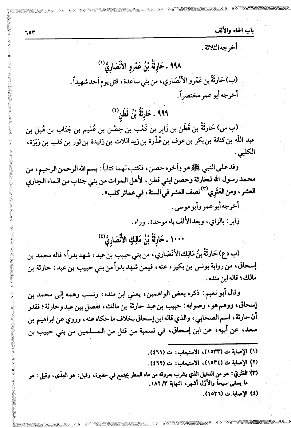 ب د ع: حارثة بْن مالك الأنصاري من بني حبيب بْن عبد، شهد بدرًا، قاله مُحَمَّد بْن إِسْحَاق، من رواية يونس بْن بكير، عنه، فيمن شهد بدرًا من بني حبيب بْن عبد: حارثة بْن مالك، قاله ابن منده.
