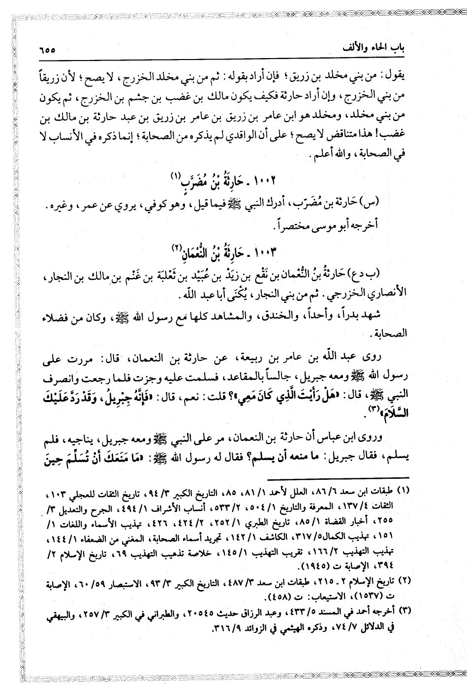 روى عَبْد اللَّهِ بْن عامر بْن ربيعة، عن حارثة ابن النعمان، قال: مررت عَلَى رَسُول اللَّهِ صَلَّى اللَّهُ عَلَيْهِ وَسَلَّمَ ومعه جبريل عليه السلام، جالسًا بالمقاعد، فسلمت عليه وجزت، فلما رجعت وانصرف النَّبِيّ صَلَّى اللَّهُ عَلَيْهِ وَسَلَّمَ قال: هل رأيت الذي كان معي؟، قلت: نعم، قال: فإنه جبريل، وقد رد عليك السلام.