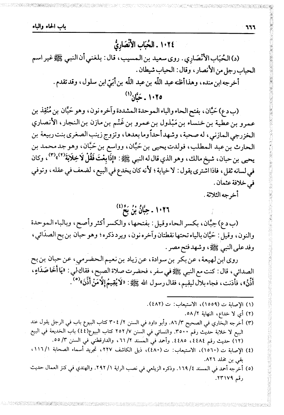 د: الحباب الأنصاري روى سَعِيد ابن المسيب، قال: بلغني أن النَّبِيّ صَلَّى اللَّهُ عَلَيْهِ وَسَلَّمَ غير اسم الحباب رجل من الأنصار، وقال: الحباب شيطان.