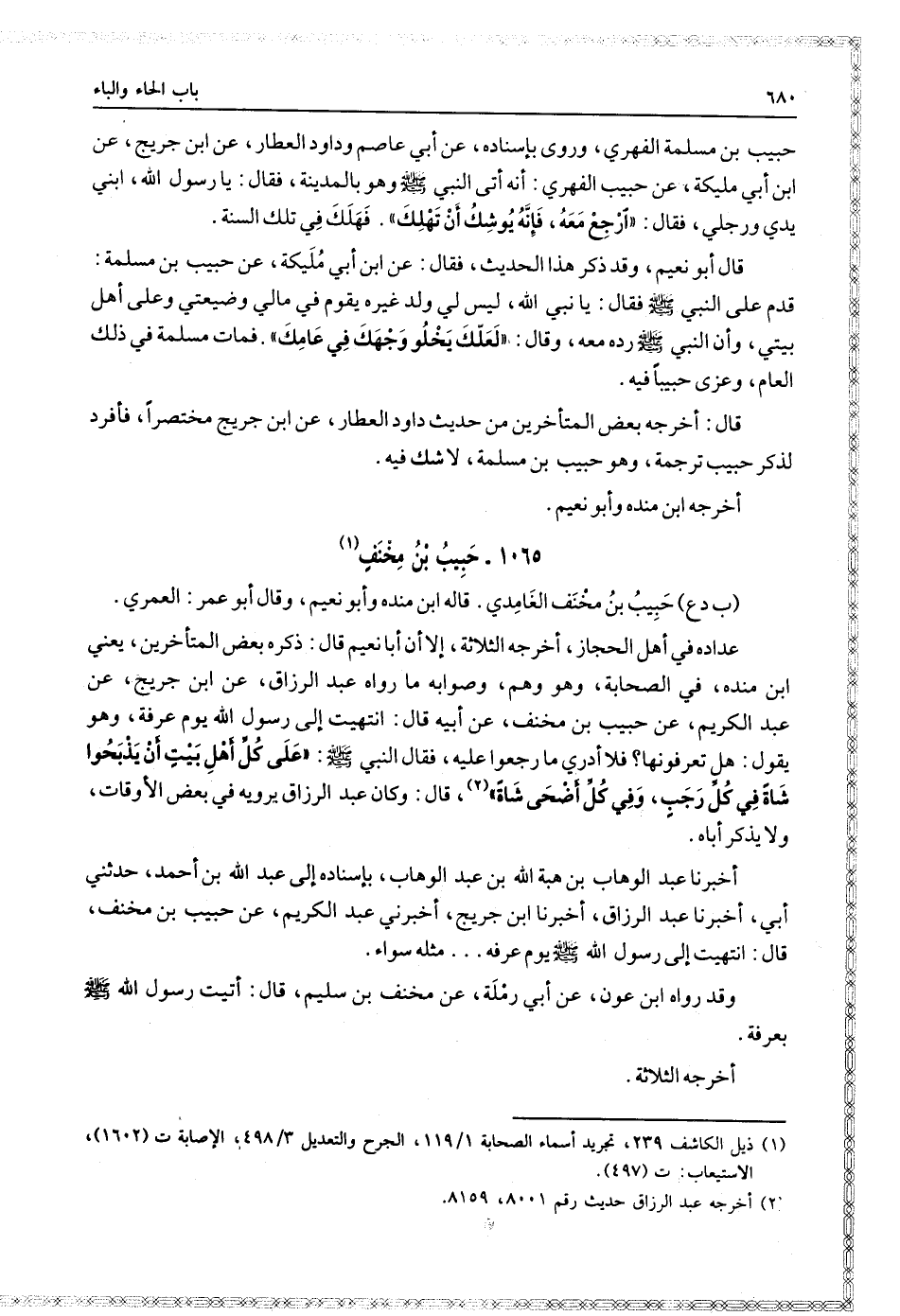 وقال أَبُو عمر: العمري، عداده في أهل الحجاز، أخرجه الثلاثة، إلا أن أبا نعيم، قال: ذكره بعض المتأخرين، يعني: ابن منده في الصحابة، وهو وهم، وصوابه: ما رواه عبد الرزاق، عن ابن جرير، عن عبد الكريم، عن حبيب بْن مخنف، عن أبيه، قال: انتهيت إِلَى رَسُول اللَّهِ صَلَّى اللَّهُ عَلَيْهِ وَسَلَّمَ يَوْم عرفة، وهو يقول: هل تعرفونها؟ فلا أدري ما رجعوا عليه، فقال النَّبِيّ صَلَّى اللَّهُ عَلَيْهِ وَسَلَّمَ: عَلَى كل أهل بيت أن يذبحوا شاة في كل رجب، وفي كل أضحى شاة، قال: وكان عبد الرزاق يرويه في بعض الأوقات، ولا يذكر أباه.