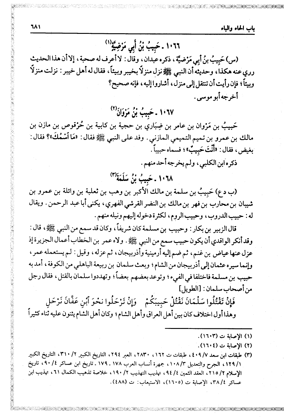 ب د ع: حبيب بْن سلمة بْن مالك الأكبر بْن وهب بْن ثعلبة بْن وائلة بْن عمرو بْن شيبان بْن محارب بْن فهر بْن مالك بْن النضر القرشي الفهري يكنى أبا عبد الرحمن ويقال له حبيب الدروب وحبيب الروم لكثرة دخوله إليهم ونيله منهم قال الزبير بْن بكار: وحبيب بْن مسلمة كان شريفا، وكان قد سمع من النَّبِيّ صَلَّى اللَّهُ عَلَيْهِ وَسَلَّمَ قال: وقد أنكر الواقدي أن يكون حبيب سمع من النَّبِيّ صَلَّى اللَّهُ عَلَيْهِ وَسَلَّمَ عمر بْن الخطاب أعمال الجزيرة إذ عزل عنها عياض بْن غنم، ثم ضم إليه أرمينية، وأذربيجان، ثم عزله، وقيل: لم يستعمله عمر، وَإِنما سيره عثمان إِلَى أذربيجان من الشام، وبعث سلمان بْن ربيعة الباهلي من الكوفة، أمد به حبيب بْن مسلمة، فاختلفا في الفيء، وتوعد بعضهم بعضا، وتهددوا سلمان بالقتل، وتوعد بعضهم بعضا، وتهددوا سلمان بالقتل، فقال رجل من أصحاب سلمان: فإن تقتلوا سلمان نقتل حبيبكم وَإِن ترحلوا نحو ابن عفان نرحل وهذا أول اختلاف كان بين أهل العراق، وأهل الشام.