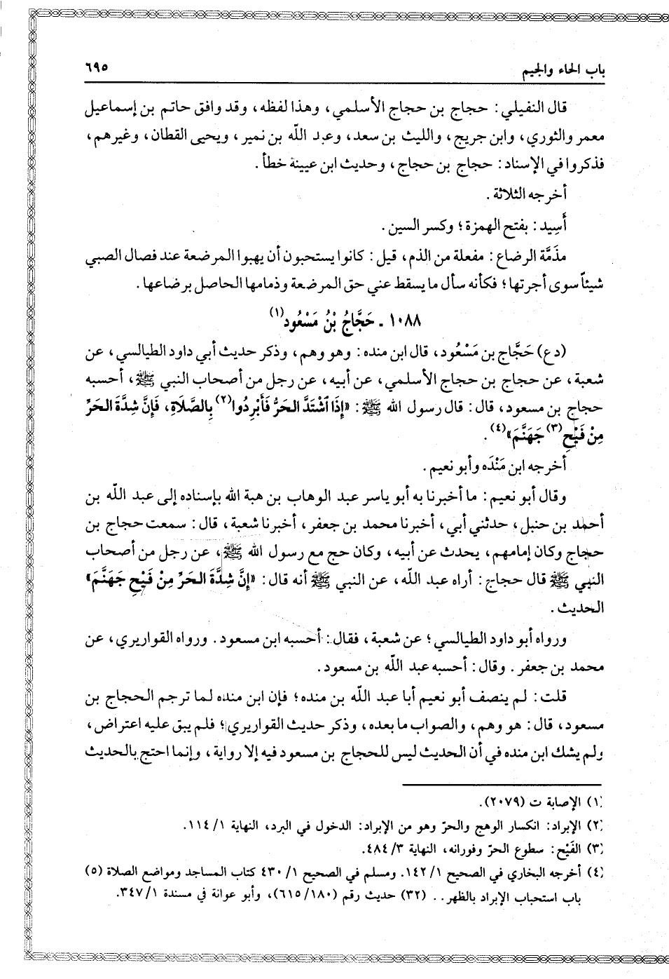 قلت: لم ينصف أَبُو نعيم أبا عَبْد اللَّهِ بْن منده، فإن ابن منده لما ترجم الحجاج بْن مسعود، قال: هو وهم، والصواب ما بعده، وذكر حديث القواريري، فلم يبق عليه اعتراض، ولم يشك ابن منده في أن الحديث ليس للحجاج ابن مسعود فيه إلا رواية، وَإِنما احتج بالحديث حيث فيه، قال: سمعت الحجاج بْن الحجاج، عن أبيه، وكانت له صحبة، وفي هذه الترجمة قال: وكان حج مع النَّبِيّ صَلَّى اللَّهُ عَلَيْهِ وَسَلَّمَ فهو احتج بالحديث لهذا، لا بالحديث، فإنه ليس فيه حجة، ولما خاف أن يظن فيه الوهم، قال: وهو وهم، وقد جعل ابن منده لهذا الحديث ترجمتين، هذه إحداهما، والثانية: حجاج الباهلي، وفيه رد أَبُو نعيم عَلَى ابن منده، لأنهما واحد، والله أعلم