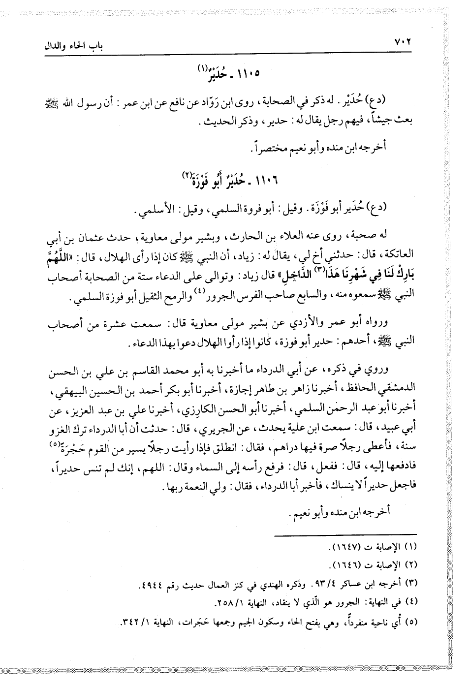 ورواه أَبُو عمر، والأزدي، عن بشير مولى معاوية، قال: سمعت عشرة من أصحاب النَّبِيّ صَلَّى اللَّهُ عَلَيْهِ وَسَلَّمَ أحدهم: حدير أَبُو فوزة، كانوا إذا رأوا الهلال دعوا بهذا الدعاء وروى في ذكره عن أَبِي الدرداء: