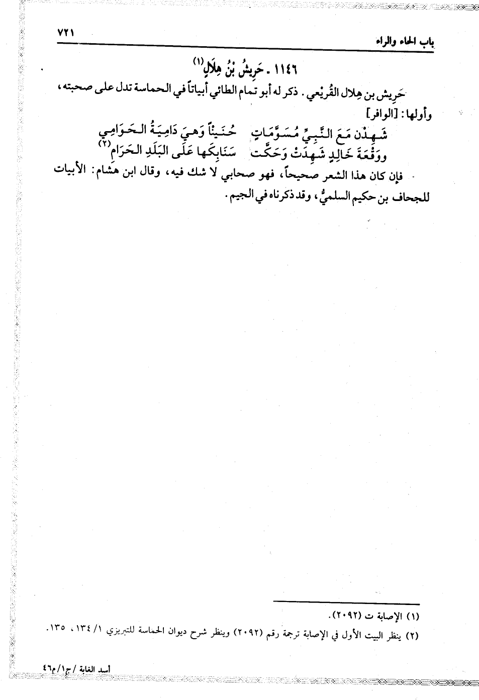 حريش بْن هلال القريعي ذكر له أَبُو تمام الطائي أبياتا في الحماسة تدل عَلَى صحبته، وأولها: