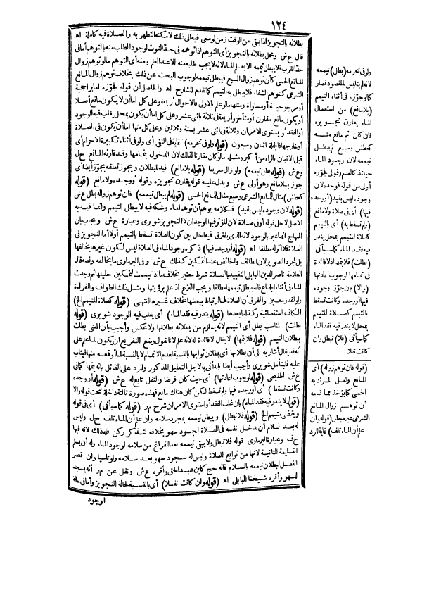 وَقَوْلِي: فَجَوَّزَهُ أَوْلَى مِنْ قَوْلِهِ: فَوَجَدَهُ لِأَنَّ وُجُودَهُ لَيْسَ بِقَيْدٍ (أَوْ وَجَدَهُ فِيهَا) أَيْ: فِي صَلَاةٍ وَلَا مَانِعَ (وَلَمْ تَسْقُطْ بِهِ) أَيْ: بِالتَّيَمُّمِ كَصَلَاةِ الْمُتَيَمِّمِ بِمَحِلٍّ يَنْدُرُ فِيهِ فَقْدُ الْمَاءِ كَمَا سَيَأْتِي (بَطَلَتْ) فَلَا يُتِمُّهَا إذْ لَا فَائِدَةَ فِي إتْمَامِهَا لِوُجُوبِ إعَادَتِهَا (وَإِلَّا) بِأَنْ جَوَّزَ وُجُودَهُ فِيهَا أَوْ وَجَدَهُ وَكَانَتْ تَسْقُطُ بِالتَّيَمُّمِ كَصَلَاةِ الْمُتَيَمِّمِ بِمَحِلٍّ لَا يَنْدُرُ فِيهِ فَقْدُ الْمَاءِ كَمَا سَيَأْتِي (فَلَا) تَبْطُلُ، وَإِنْ كَانَتْ نَفْلًا