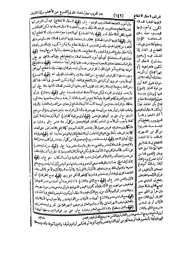 (قَوْلُهُ أَوْلَى مِنْ قَوْلِهِ كَامِلَيْنِ) أَيْ لِأَنَّ رَمَضَانَ قَدْ لَا يَكُونُ كَامِلًا. وَأُجِيبُ بِأَنَّ الْأَصْلَ إنَّمَا عَبَّرَ بِكَامِلَيْنِ لِقَوْلِهِ فَيَحْصُلُ مِنْ كُلِّ أَرْبَعَةَ عَشَرَ ع ش، وَعِبَارَةُ م ر فَالْكَمَالُ فِي رَمَضَانَ قَيْدٌ لِغَرَضِ حُصُولِ الْأَرْبَعَةَ عَشَرَ لَا لِبَقَاءِ الْيَوْمَيْنِ كَمَا لَا يَخْفَى فَلَا اعْتِرَاضَ عَلَى الْمُصَنِّفِ كَمَا لَا يُعْتَرَضُ عَلَيْهِ بِأَنَّهُ لَا يَبْقَى عَلَيْهَا شَيْءٌ إذَا عَلِمَتْ أَنَّ الِانْقِطَاعَ كَانَ لَيْلًا لِوُضُوحِهِ أَيْضًا. اهـ (قَوْلُهُ إنْ لَمْ تَعْتَدَّ إلَخْ) أَيْ قَبْلَ التَّخَيُّرِ. (قَوْلُهُ فَيَفْسُدُ سِتَّةَ عَشَرَ يَوْمًا) فَيَحْصُلُ لَهَا مِنْ كُلِّ أَرْبَعَةَ عَشَرَ إنْ كَانَ رَمَضَانُ كَامِلًا وَإِلَّا فَيَحْصُلُ لَهَا مِنْهُ ثَلَاثَةَ عَشَرَ وَالْمَقْضِيُّ مِنْهُ بِكُلِّ حَالٍ سِتَّةَ عَشَرَ يَوْمًا ح ل. (قَوْلُهُ مِنْ ثَمَانِيَةَ عَشَرَ) هِيَ تُكْتَبُ بِالْأَلِفِ إنْ كَانَ فِيهَا تَاءُ التَّأْنِيثِ فَإِنْ لَمْ تَكُنْ فِيهَا بِأَنْ كَانَ الْمَعْدُودُ مُؤَنَّثًا نُظِرَ إنْ أَتَيْت بِالْيَاءِ فَقُلْت ثَمَنِي عَشَرَةَ فَبِغَيْرِ أَلِفٍ وَإِلَّا فَبِأَلِفٍ، نَحْوُ ثَمَانِ عَشَرَةَ قَالَهُ ابْنُ قُتَيْبَةَ فِي أَدَبِ الْكَاتِبِ سم ع ش. (قَوْلُهُ ثَلَاثَةٌ أَوَّلُهَا إلَخْ) هَذَا إشَارَةٌ إلَى قَاعِدَةٍ وَهِيَ أَنْ تَصُومَ بِقَدْرِ مَا عَلَيْهَا مُتَوَالِيًا مِنْ أَوَّلِ ثَمَانِيَةَ عَشَرَ وَمَعَ سَابِعَ عَشَرَهَا وَتَضُمُّ إلَى ذَلِكَ يَوْمَيْنِ مُتَّصِلَيْنِ بِالْأَوَّلِ أَوْ بِالثَّانِي أَوَّلًا وَلَا أَوْ أَحَدُهُمَا بِالْأَوَّلِ وَالْآخَرُ بِالثَّانِي، وَهَذِهِ الْقَاعِدَةُ تَجْرِي فِي قَضَاءِ أَرْبَعَةَ عَشَرَ فَمَا دُونَهَا كَمَا يَظْهَرُ لِلْمُتَأَمِّلِ شَوْبَرِيٌّ، (قَوْلُهُ صَحَّ الطَّرَفَانِ) أَيْ الْأَوَّلُ وَالثَّامِنَ عَشَرَ ع ش.