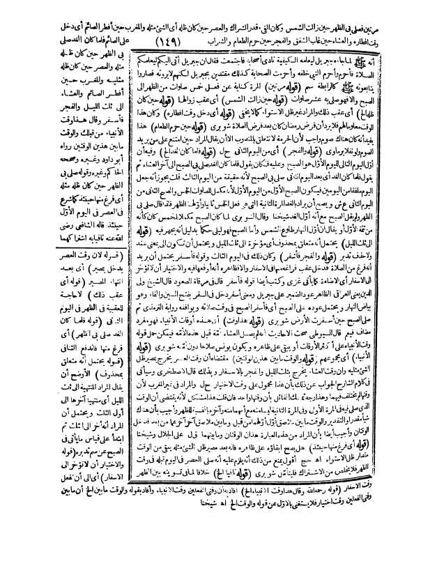 (قَوْلُهُ مَرَّتَيْنِ) الْمَرَّةُ كِنَايَةٌ عَنْ فِعْلِ خَمْسِ صَلَوَاتٍ مِنْ الظُّهْرِ إلَى الصُّبْحِ وَإِلَّا فَهُوَ صَلَّى بِهِ عَشْرَ صَلَوَاتٍ. (قَوْلُهُ حِينَ زَالَتْ الشَّمْسُ) أَيْ عَقِبَ زَوَالِهَا. (قَوْلُهُ حِينَ كَانَ ظِلُّهُ إلَخْ) أَيْ عَقِبَ ذَلِكَ. وَالْمُرَادُ غَيْرُ ظِلِّ الِاسْتِوَاءِ كَمَا لَا يَخْفَى. (قَوْلُهُ أَيْ دَخَلَ وَقْتُ إفْطَارِهِ) وَكَانَ هَذَا الْوَقْتُ مَعْلُومًا لَهُمْ، فَلَا يَرِدُ أَنَّ فَرْضَ رَمَضَانَ كَانَ بَعْدَ فَرْضِ الصَّلَاةِ شَوْبَرِيٌّ. (قَوْلُهُ حِينَ حَرُمَ الطَّعَامُ) هَذَا يُفِيدُ أَنَّهُ كَانَ هُنَاكَ صَوْمٌ وَاجِبٌ لِأَنَّ الْحُرْمَةَ لَا تَتَعَلَّقُ بِالْمَنْدُوبِ إلَّا أَنْ يُقَالَ الْمُرَادُ حِينَ امْتَنَعَ عَلَى مَنْ يُرِيدُ الصَّوْمَ وَلَوْ نَفْلًا بِرْمَاوِيٌّ. (قَوْلُهُ وَالْفَجْرُ) أَيْ مِنْ الْيَوْمِ الثَّانِي ح ل. (قَوْلُهُ فَلَمَّا كَانَ الْغَدُ إلَخْ) وَفِيهِ أَنَّ أَوَّلَ الْيَوْمِ التَّالِي لِلْيَوْمِ الْأَوَّلِ هُوَ الصُّبْحُ، وَعَلَيْهِ فَكَانَ يَقُولُ: فَلَمَّا كَانَ الْغَدُ صَلَّى بِي الصُّبْحَ إلَى آخِرِ الْعِشَاءِ ثُمَّ يَقُولُ: فَلَمَّا كَانَ الْغَدُ أَيْ بَعْدَ الْيَوْمِ الثَّانِي صَلَّى بِي الصُّبْحَ لِأَنَّهُ حَقِيقَةٌ مِنْ الْيَوْمِ الثَّالِثِ. قُلْت: يَجُوزُ أَنَّهُ جَعَلَ الْيَوْمَ مُلَفَّقًا مِنْ الْيَوْمَيْنِ فَيَكُونُ الصُّبْحُ الْأَوَّلُ مِنْ الْيَوْمِ الْأَوَّلِ لِأَنَّهُ مُكَمِّلٌ لِلصَّلَوَاتِ الْخَمْسِ وَالصُّبْحُ الثَّانِي مِنْ الْيَوْمِ الثَّانِي ع ش. وَيَصِحُّ أَنْ يُرَادَ بِالْغَدِ الْمَرَّةُ الثَّانِيَةُ الَّتِي هِيَ فِعْلُ الْخَمْسِ ثَانِيًا وَأَوَّلُهَا الظُّهْرُ؛ فَلِذَا قَالَ: صَلَّى بِي الظُّهْرَ وَلَمْ يَقُلْ الصُّبْحَ. مَعَ أَنَّهُ أَوَّلَ الْغَدِ شَيْخُنَا. وَقَالَ الشَّوْبَرِيُّ لَمَّا كَانَ الصُّبْحُ مُكَمِّلًا لِلْخَمْسِ كَانَ كَأَنَّهُ مِنْ تَتِمَّةِ الْأَوَّلِ، أَوْ يُقَالُ إنَّ أَوَّلَ النَّهَارِ طُلُوعُ الشَّمْسِ، وَأَمَّا الصُّبْحُ فَهُوَ لَيْلِيٌّ حُكْمًا بِدَلِيلِ أَنَّهُ يَجْهَرُ فِيهِ. (قَوْلُهُ إلَى ثُلُثِ اللَّيْلِ) يُحْتَمَلُ أَنَّهُ مُتَعَلِّقٌ بِمَحْذُوفٍ أَيْ مُؤَخَّرَةٌ إلَى ثُلُثِ اللَّيْلِ، وَيُحْتَمَلُ أَنْ تَكُونَ إلَى بِمَعْنَى عِنْدَ وَلَا حَذْفَ تَدَبَّرْ.
