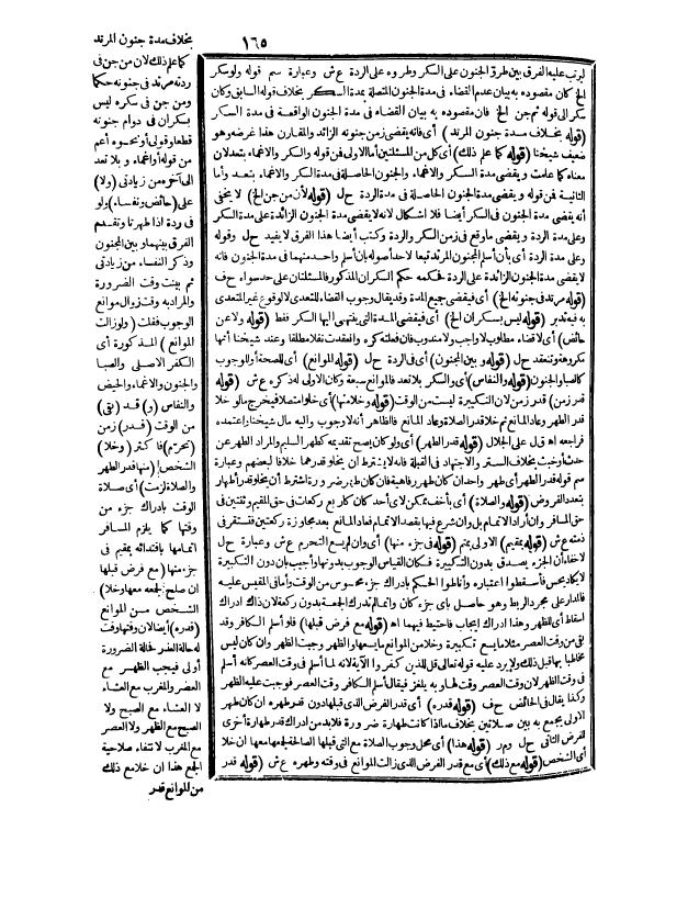 بِخِلَافِ مُدَّةِ جُنُونِ الْمُرْتَدِّ كَمَا عُلِمَ ذَلِكَ لِأَنَّ مَنْ جُنَّ فِي رِدَّتِهِ مُرْتَدٌّ فِي جُنُونِهِ حُكْمًا، وَمَنْ جُنَّ فِي سُكْرِهِ لَيْسَ بِسَكْرَانَ فِي دَوَامِ جُنُونِهِ قَطْعًا، وَقَوْلِي أَوْ نَحْوِهِ أَعَمُّ مِنْ قَوْلِهِ أَوْ إغْمَاءٍ وَبِلَا تَعَدٍّ إلَى آخِرِهِ مِنْ زِيَادَتِي.