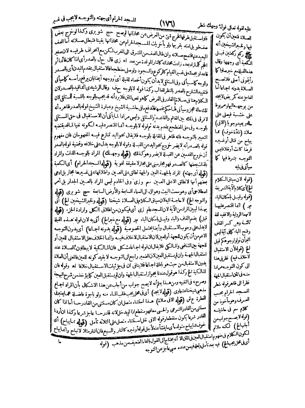 ـــــــــــــــــــــــــــــQفَلَوْ اسْتَقْبَلَ طَرَفَهَا فَخَرَجَ شَيْءٌ مِنْ الْعَرْضِ عَنْ مُحَاذَاتِهَا لَمْ يَصِحَّ حَجّ شَوْبَرِيٌّ وَكَذَا لَوْ خَرَجَ بَعْضُ صَفٍّ طَوِيلٍ امْتَدَّ بِقُرْبِهَا وَلَوْ بِأُخْرَيَاتِ الْمَسْجِدِ الْحَرَامِ عَنْ مُحَاذَاتِهَا يَقِينًا فَتَبْطُلُ صَلَاتُهُ، أَمَّا الصَّفُّ الْبَعِيدُ عَنْهَا فَتَصِحُّ صَلَاتُهُ وَإِنْ طَالَ الصَّفُّ مِنْ الْمَشْرِقِ إلَى الْمَغْرِبِ لَكِنْ مَعَ انْحِرَافِ طَرَفَيْهِ؛ لِأَنَّ صَغِيرَ الْحَجْمِ كُلَّمَا زَادَ بُعْدُهُ زَادَتْ مُحَاذَاتُهُ كَالنَّارِ الْمُوقَدَةِ مِنْ بُعْدٍ. اهـ. ز ي قَالَ ح ل: بِالصَّدْرِ أَيْ: إذَا كَانَ قَائِمًا أَوْ قَاعِدًا وَبِجُمْلَتِهِ فِي غَيْرِ الْقِيَامِ كَالرُّكُوعِ وَالسُّجُودِ، وَلَوْ صَلَّى مُضْطَجِعًا فَالِاسْتِقْبَالُ بِمُقَدَّمِ الْبَدَنِ أَيْ: بِالصَّدْرِ وَالْوَجْهِ كَمَا سَيَأْتِي وَفِي الْمُسْتَلْقِي لَا بُدَّ أَنْ يَكُونَ أَخْمَصَاهُ لِلْقِبْلَةِ أَيْ وَوَجْهُهُ أَيْضًا بِأَنْ يَرْفَعَ رَأْسَهُ كَمَا سَيَأْتِي فَتَقْيِيدُ الشَّارِحِ بِالصَّدْرِ بِالنَّظَرِ لِلْغَالِبِ، وَكَذَا قَوْلُهُ: لَا بِالْوَجْهِ ح ف وَقَالَ الرَّشِيدِيُّ: إنَّمَا قَيَّدَ بِالصَّدْرِ؛ لِأَنَّ الْكَلَامَ هُنَا فِي صَلَاةِ الْقَادِرِ فِي الْفَرْضِ كَمَا هُوَ نَصُّ الْمَتْنِ فَلَا يَرِدُ أَنَّهُ قَدْ يَجِبُ بِالْوَجْهِ بِالنِّسْبَةِ لِلْمُسْتَلْقِي؛ لِأَنَّ تِلْكَ حَالَةُ عَجْزٍ، وَسَيَأْتِي لَهَا حُكْمٌ يَخُصُّهَا فَانْدَفَعَ مَا فِي حَاشِيَةِ الشَّيْخِ، وَعِبَارَةُ الشَّيْخِ