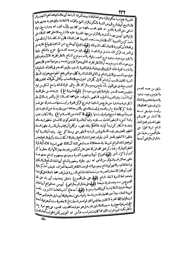 مَا يَلْزَمُ مِنْ عَدَمِهِ الْعَدَمُ، وَلَا يَلْزَمُ مِنْ وُجُودِهِ وُجُودٌ، وَلَا عَدَمٌ لِذَاتِهِ. فَشُرُوطُ الصَّلَاةِ مَا يَتَوَقَّفُ عَلَيْهَا صِحَّةُ الصَّلَاةِ وَلَيْسَتْ مِنْهَا وَهِيَ تِسْعَةٌ بِالِاكْتِفَاءِ عَنْ الْإِسْلَامِ، بِطُهْرِ الْحَدَثِ وَبِجَعْلِ انْتِفَاءِ الْمَانِعِ شَرْطًا تَجَوُّزًا عَلَى مَا فِي الْمَجْمُوعِ وَحَقِيقَةً عَلَى مَا مَالَ إلَيْهِ الرَّافِعِيُّ أَحَدُهَا