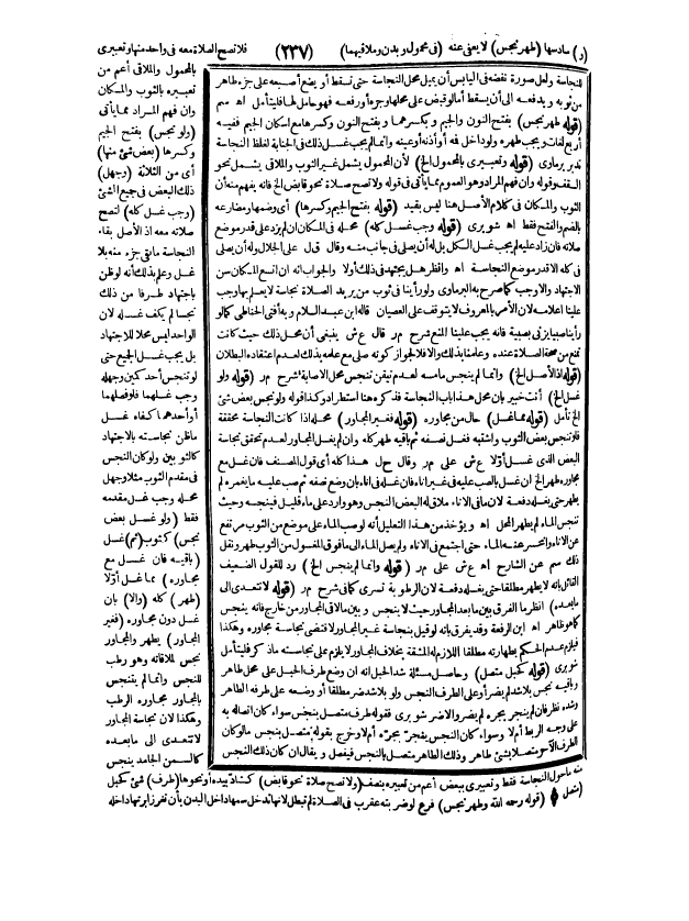(وَ) سَادِسُهَا (طُهْرُ نَجَسٍ) لَا يُعْفَى عَنْهُ (فِي مَحْمُولٍ، وَبَدَنٍ، وَمُلَاقِيهِمَا) فَلَا تَصِحُّ الصَّلَاةُ مَعَهُ فِي وَاحِدٍ مِنْهَا، وَتَعْبِيرِي بِالْمَحْمُولِ، وَالْمُلَاقِي أَعَمُّ مِنْ تَعْبِيرِهِ بِالثَّوْبِ، وَالْمَكَانِ، وَإِنْ فُهِمَ الْمُرَادُ مِمَّا يَأْتِي. (وَلَوْ نَجِسَ) بِفَتْحِ الْجِيمِ، وَكَسْرِهَا (بَعْضُ شَيْءٍ مِنْهَا) أَيْ: مِنْ الثَّلَاثَةِ (وَجَهِلَ) ذَلِكَ الْبَعْضَ فِي جَمِيعِ الشَّيْءِ (وَجَبَ غَسْلُ كُلِّهِ) ؛ لِتَصِحَّ صَلَاتُهُ مَعَهُ إذْ الْأَصْلُ بَقَاءُ النَّجَاسَةِ مَا بَقِيَ جُزْءٌ مِنْهُ بِلَا غَسْلٍ، وَعُلِمَ بِذَلِكَ أَنَّهُ لَوْ ظَنَّ بِاجْتِهَادٍ طَرَفًا مِنْ ذَلِكَ نَجِسًا لَمْ يَكْفِ غَسْلُهُ؛ لِأَنَّ الْوَاحِدَ لَيْسَ مَحِلًّا لِلِاجْتِهَادِ بَلْ يَجِبُ غَسْلُ الْجَمِيعِ، حَتَّى لَوْ تَنَجَّسَ أَحَدُ كُمَّيْنِ، وَجَهِلَهُ، وَجَبَ غَسْلُهُمَا فَلَوْ فَصَلَهُمَا، أَوْ أَحَدَهُمَا كَفَاهُ غَسْلُ مَا ظَنَّ نَجَاسَتَهُ بِالِاجْتِهَادِ كَالثَّوْبَيْنِ، وَلَوْ كَانَ النَّجَسُ فِي مُقَدِّمِ الثَّوْبِ مَثَلًا، وَجَهِلَ مَحَلَّهُ، وَجَبَ غَسْلُ مُقَدِّمِهِ فَقَطْ (وَلَوْ غَسَلَ بَعْضَ نَجِسٍ) كَثَوْبٍ (ثُمَّ) غَسَلَ (بَاقِيَهُ فَإِنْ غُسِلَ مَعَ مُجَاوِرِهِ) مِمَّا غُسِلَ أَوَّلًا (طَهُرَ) كُلُّهُ (وَإِلَّا) بِأَنْ غُسِلَ دُونَ مُجَاوِرِهِ (فَغَيْرُ الْمُجَاوِرِ) يَطْهُرُ، وَالْمُجَاوِرُ نَجِسٌ لِمُلَاقَاتِهِ، وَهُوَ رَطْبٌ لِلنَّجِسِ، وَإِنَّمَا لَمْ يَتَنَجَّسْ بِالْمُجَاوِرِ مُجَاوِرُهُ الرَّطْبُ، وَهَكَذَا؛ لِأَنَّ نَجَاسَةَ الْمُجَاوِرِ لَا تَتَعَدَّى إلَى مَا بَعْدَهُ كَالسَّمْنِ الْجَامِدِ يَنْجُسُ مِنْهُ مَا حَوْلَ النَّجَاسَةِ فَقَطْ، وَتَعْبِيرِي " بِبَعْضٍ " أَعَمُّ مِنْ تَعْبِيرِهِ " بِنِصْفٍ ".