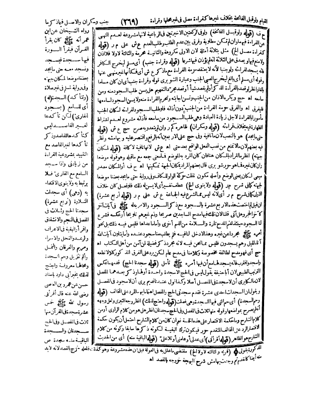 ـــــــــــــــــــــــــــــQ (قَوْلُهُ: وَلَوْ قَبْلَ الْفَاتِحَةِ) وَلَوْ فِي الرَّكْعَتَيْنِ الْأَخِيرَتَيْنِ فِي الرُّبَاعِيَّةِ؛ لِأَنَّهَا مَشْرُوعَةٌ لِعَدَمِ النَّهْيِ عَنْ الْقِرَاءَةِ فِيهِمَا، وَإِنْ لَمْ تَكُنْ مَطْلُوبَةً وَفَرَّقَ بَيْنَ عَدَمِ الطَّلَبِ وَطَلَبِ الْعَدَمِ ع ش عَلَى م ر. (قَوْلُهُ: كَقِرَاءَةِ مُصَلٍّ إلَخْ) مَثَّلَ بِثَلَاثَةِ أَمْثِلَةٍ؛ لِأَنَّ الْأُولَى مَكْرُوهَةٌ، وَالثَّانِيَةُ مُحَرَّمَةٌ وَالثَّالِثَةُ لَا، وَلَا فَلَا إذْنَ، وَلَا مَنْعَ فِيهَا وَيَصْدُقُ عَلَى الثَّلَاثَةِ أَنَّهُ لَمْ يُؤْذَنْ فِيهَا شَرْعًا. (قَوْلُهُ: وَقِرَاءَةُ جُنُبٍ) أَيْ: مُسْلِمٍ لِيَخْرُجَ الْكَافِرُ فَإِنَّهُ يَسْجُدُ لِقِرَاءَتِهِ وَلَوْ جُنُبًا؛ لِأَنَّهُ لَا يَعْتَقِدُ حُرْمَةَ الْقِرَاءَةِ مَعَ مَا ذُكِرَ ع ش أَيْ فَكَأَنَّهَا غَيْرُ مَنْهِيٍّ عَنْهَا وَقَوْلُهُ: أَيْ مُسْلِمٌ أَيْ بَالِغٌ لِيَخْرُجَ الصَّبِيُّ الْجُنُبُ وَعِبَارَةُ الشَّوْبَرِيِّ قَوْلُهُ: وَقِرَاءَةُ جُنُبٍ أَيْ إنْ كَانَ مُسْلِمًا بَالِغًا وَانْظُرْ لَوْ قَصَدَ بِالْقِرَاءَةِ الذِّكْرَ، أَوْ لَمْ يَقْصِدْ شَيْئًا، أَوْ قَصَدَ مُجَرَّدَ التَّفْهِيمِ هَلْ يُسَنُّ طَلَبُ السُّجُودِ مِنْهُ وَمِنْ سَامِعِهِ؟ . اهـ. حَجّ وَيُكْرَهُ الْأَذَانُ مِنْ الْجُنُبِ وَتُسَنُّ إجَابَتُهُ وَتَحْرُمُ الْقِرَاءَةُ مِنْهُ وَلَا يُسَنُّ السُّجُودُ لِسَامِعِهَا، فَلْيُفَرَّقْ. اهـ وَالْفَرْقُ حُرْمَةُ الْقِرَاءَةِ مِنْ الْجُنُبِ دُونَ أَذَانِهِ، فَلَوْ طَلَبَ السُّجُودَ لِقِرَاءَتِهِ لَكَانَ الْجُنُبُ مَأْمُورًا بِالْقِرَاءَةِ لِأَجْلِ زِيَادَةِ الْعِبَادَةِ وَهِيَ طَلَبُ السُّجُودِ مِنْ سَامِعِهِ فَأَذَانُهُ مَشْرُوعٌ لِعَدَمِ اشْتِرَاطِ الطَّهَارَةِ فِيهِ بِخِلَافِ قِرَاءَتِهِ. (قَوْلُهُ: وَسَكْرَانَ) ظَاهِرُهُ كَ م ر وَإِنْ لَمْ يَتَعَدَّ وَبِهِ صَرَّحَ حَجّ ع ش.