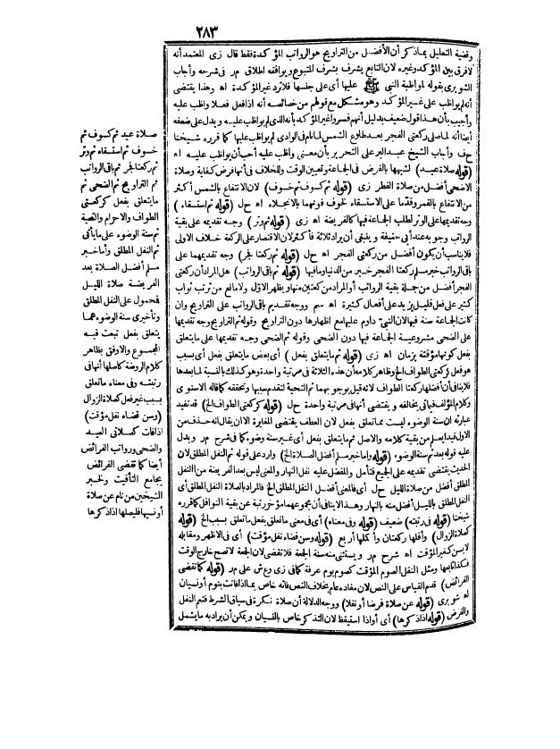 صَلَاةُ عِيدٍ ثُمَّ كُسُوفٌ ثُمَّ خُسُوفٌ ثُمَّ اسْتِسْقَاءٌ ثُمَّ وِتْرٌ ثُمَّ رَكْعَتَا فَجْرٍ ثُمَّ بَاقِي الرَّوَاتِبِ ثُمَّ التَّرَاوِيحُ ثُمَّ الضُّحَى ثُمَّ مَا يَتَعَلَّقُ بِفِعْلٍ كَرَكْعَتَيْ الطَّوَافِ، وَالْإِحْرَامِ، وَالتَّحِيَّةِ ثُمَّ سُنَّةُ الْوُضُوءِ عَلَى مَا يَأْتِي ثُمَّ النَّفَلُ الْمُطْلَقُ، وَأَمَّا خَبَرُ مُسْلِمٍ «أَفْضَلُ الصَّلَاةِ بَعْدَ الْفَرِيضَةِ صَلَاةُ اللَّيْلِ» فَمَحْمُولٌ عَلَى النَّفْلِ الْمُطْلَقِ، وَتَأْخِيرِي سُنَّةَ الْوُضُوءِ عَمَّا تَعَلَّقَ بِفِعْلٍ تَبِعْتُ فِيهِ الْمَجْمُوعَ، وَالْأَوْفَقُ بِظَاهِرِ كَلَامِ الرَّوْضَةِ كَأَصْلِهَا أَنَّهَا فِي رُتْبَتِهِ، وَفِي مَعْنَاهُ مَا تَعَلَّقَ بِسَبَبٍ غَيْرِ فِعْلٍ كَصَلَاةِ الزَّوَالِ.
