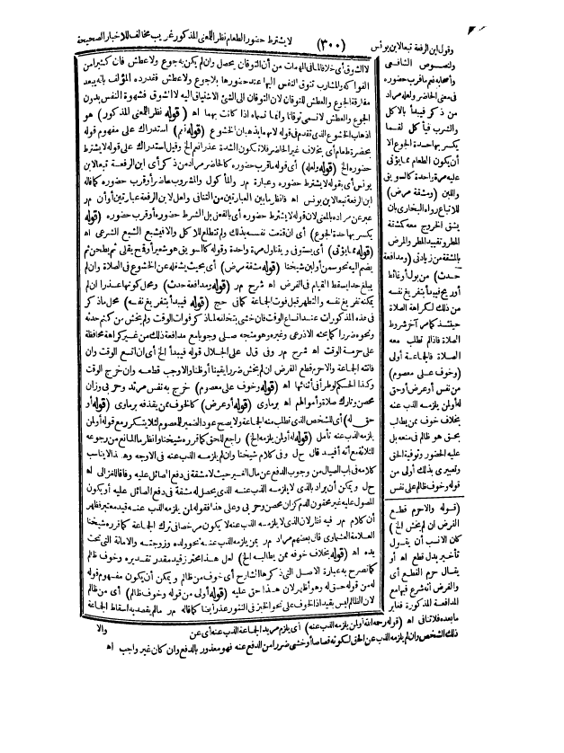 وَقَوْلُ ابْنِ الرِّفْعَةِ تَبَعًا لِابْنِ يُونُسَ لَا يُشْتَرَطُ حُضُورُ الطَّعَامِ نَظَرًا لِلْمَعْنَى الْمَذْكُورِ غَرِيبٌ مُخَالِفٌ لِلْأَخْبَارِ الصَّحِيحَةِ وَلِنُصُوصِ الشَّافِعِيِّ، وَأَصْحَابِهِ نَعَمْ مَا قَرُبَ حُضُورُهُ فِي مَعْنَى الْحَاضِرِ وَلَعَلَّهُ مُرَادُ مَنْ ذُكِرَ فَيَبْدَأُ بِالْأَكْلِ وَالشُّرْبِ فَيَأْكُلُ لُقَمًا يَكْسِرُ بِهَا حِدَّةَ الْجُوعِ إلَّا أَنْ يَكُونَ الطَّعَامُ مِمَّا يُؤْتَى عَلَيْهِ مَرَّةً وَاحِدَةً كَالسَّوِيقِ وَاللَّبَنِ (وَمَشَقَّةِ مَرَضٍ) لِلِاتِّبَاعِ رَوَاهُ الْبُخَارِيُّ بِأَنْ يَشُقَّ الْخُرُوجُ مَعَهُ كَمَشَقَّةِ الْمَطَرِ وَتَقْيِيدُ الْمَطَرِ، وَالْمَرَضِ بِالْمَشَقَّةِ مِنْ زِيَادَتِي. (وَمُدَافَعَةُ حَدَثٍ) مِنْ بَوْلٍ أَوْ غَائِطٍ أَوْ رِيحٍ فَيَبْدَأُ بِتَفْرِيغِ نَفْسِهِ مِنْ ذَلِكَ لِكَرَاهَةِ الصَّلَاةِ حِينَئِذٍ كَمَا مَرَّ آخِرَ شُرُوطِ الصَّلَاةِ فَإِذَا لَمْ تُطْلَبْ مَعَهُ الصَّلَاةُ فَالْجَمَاعَةُ أَوْلَى (وَخَوْفٍ عَلَى مَعْصُومٍ) مِنْ نَفْسٍ أَوْ عِرْضٍ أَوْ حَقٍّ لَهُ أَوْ لِمَنْ يَلْزَمُهُ الذَّبُّ عَنْهُ بِخِلَافِ خَوْفٍ مِمَّنْ يُطَالِبُ بِحَقٍّ هُوَ ظَالِمٌ فِي مَنْعِهِ بَلْ عَلَيْهِ الْحُضُورُ وَتَوْفِيَةُ الْحَقِّ وَتَعْبِيرِي بِذَلِكَ أَوْلَى مِنْ قَوْلِهِ وَخَوْفِ ظَالِمٍ عَلَى نَفْسٍ