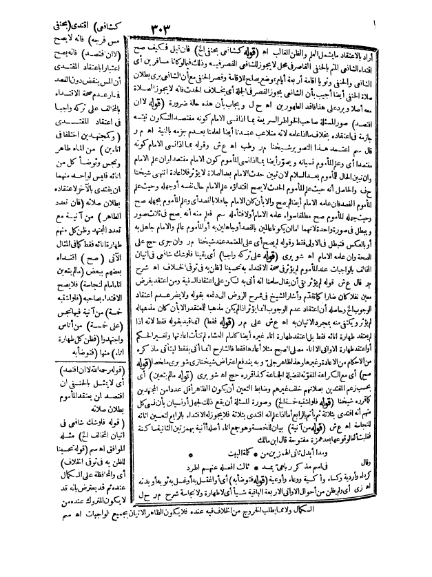 كَشَافِعِيٍّ) اقْتَدَى (بِحَنَفِيٍّ مَسَّ فَرْجَهُ) فَإِنَّهُ لَا يَصِحُّ (لَا إنْ افْتَصَدَ) فَإِنَّهُ يَصِحُّ اعْتِبَارًا بِاعْتِقَادِ الْمُقْتَدِي أَنَّ الْمَسَّ يَنْقُضُ دُونَ الْفَصْدِ فَمَدَارُ عَدَمِ صِحَّةِ الِاقْتِدَاءِ بِالْمُخَالِفِ عَلَى تَرْكِهِ وَاجِبًا فِي اعْتِقَادِ الْمُقْتَدِي (وَكَمُجْتَهِدَيْنِ اخْتَلَفَا فِي إنَاءَيْنِ) مِنْ الْمَاءِ طَاهِرٍ وَنَجِسٍ وَتَوَضَّأَ كُلٌّ مِنْ إنَائِهِ فَلَيْسَ لِوَاحِدٍ مِنْهُمَا أَنْ يَقْتَدِيَ بِالْآخَرِ لِاعْتِقَادِهِ بُطْلَانَ صَلَاتِهِ (فَإِنْ تَعَدَّدَ الطَّاهِرُ) مِنْ آنِيَةٍ مَعَ تَعَدُّدِ الْمُجْتَهِدِ وَظَنَّ كُلٌّ مِنْهُمْ طَهَارَةَ إنَائِهِ فَقَطْ كَمَا فِي الْمِثَالِ الْآتِي (صَحَّ) اقْتِدَاءُ بَعْضِهِمْ بِبَعْضٍ (مَا لَمْ يَتَعَيَّنْ إنَاءُ إمَامٍ لِنَجَاسَةٍ) فَلَا يَصِحُّ الِاقْتِدَاءُ بِصَاحِبِهِ (فَلَوْ اشْتَبَهَ خَمْسَةٌ) مِنْ آنِيَةٍ (فِيهَا نَجَسٌ عَلَى خَمْسَةٍ) مِنْ أُنَاسٍ وَاجْتَهَدُوا (فَظَنَّ كُلٌّ طَهَارَةَ إنَاءٍ) مِنْهَا (فَتَوَضَّأَ بِهِ