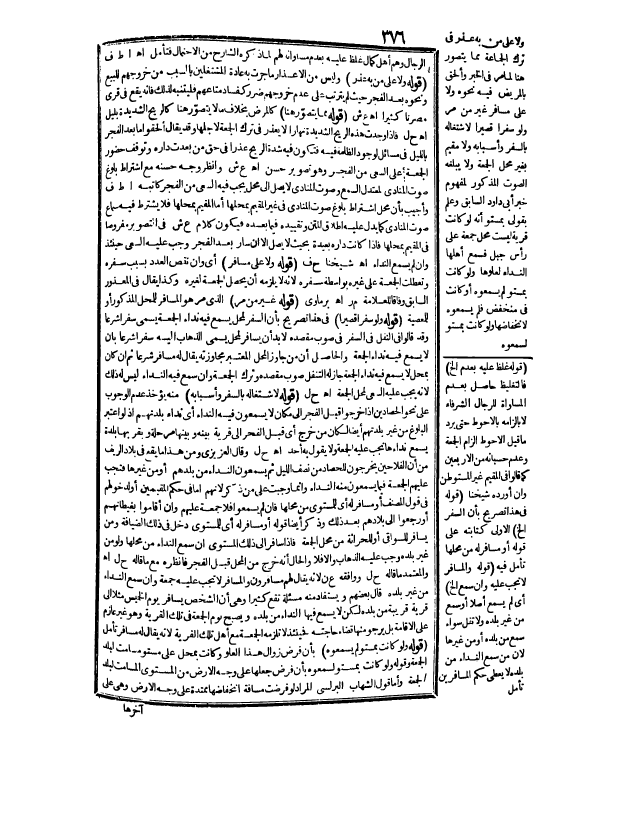 وَقَالَ الْعَزِيزِيُّ: وَمِنْ هَذَا مَا يَقَعُ فِي بِلَادِ الرِّيفِ مِنْ أَنَّ الْفَلَّاحِينَ يَخْرُجُونَ لِلْحَصَادِ مِنْ نِصْفِ اللَّيْلِ ثُمَّ يَسْمَعُونَ النِّدَاءَ مِنْ بَلَدِهِمْ، أَوْ مِنْ غَيْرِهَا فَتَجِبُ عَلَيْهِمْ الْجُمُعَةُ فِيمَا يَسْمَعُونَ مِنْهُ النِّدَاءَ وَإِنَّمَا وَجَبَتْ عَلَى مَنْ ذُكِرَ لِأَنَّهُمْ إمَّا فِي حُكْمِ الْمُقِيمِينَ أَوْ لِدُخُولِهِمْ فِي قَوْلِ الْمُصَنِّفِ أَوْ مُسَافِرٌ لَهُ أَيْ: لِلْمُسْتَوِي مِنْ مَحَلِّهَا فَإِنْ لَمْ يَسْمَعُوا فَلَا جُمُعَةَ عَلَيْهِمْ، وَإِنْ أَقَامُوا بِغِيطَانِهِمْ أَوْ رَجَعُوا إلَى بِلَادِهِمْ بَعْدَ ذَلِكَ، وَذَكَرَ أَيْضًا قَوْلَهُ أَوْ مُسَافِرٌ لَهُ أَيْ: لِلْمُسْتَوِي دَخَلَ فِي ذَلِكَ الضِّيَافَةُ، وَمَنْ يُسَافِرُ لِلسَّوَاقِي، أَوْ لِلْحِرَاثَةِ مِنْ مَحَلِّ الْجُمُعَةِ فَإِذَا سَافَرَ إلَى ذَلِكَ الْمُسْتَوِي إنْ سَمِعَ النِّدَاءَ مِنْ مَحَلِّهَا، وَلَوْ مِنْ غَيْرِ بَلَدِهِ وَجَبَ عَلَيْهِ الذَّهَابُ وَإِلَّا فَلَا وَالْحَالُ أَنَّهُ خَرَجَ مِنْ الْمَحَلِّ قَبْلَ الْفَجْرِ فَانْظُرْهُ مَعَ مَا قَالَهُ ح ل. اهـ وَالْمُعْتَمَدُ مَا قَالَهُ ح ل وَوَافَقَهُ ع ن لِأَنَّهُ يُقَالُ: لَهُمْ مُسَافِرُونَ، وَالْمُسَافِرُ لَا تَجِبُ عَلَيْهِ جُمُعَةٌ، وَإِنْ سَمِعَ النِّدَاءَ مِنْ غَيْرِ بَلَدِهِ قَالَ بَعْضُهُمْ: وَيُسْتَفَادُ مِنْهُ مَسْأَلَةٌ تَقَعُ كَثِيرًا وَهِيَ أَنَّ الشَّخْصَ يُسَافِرُ يَوْمَ الْخَمِيسِ مَثَلًا إلَى قَرْيَةٍ قَرِيبَةٍ مِنْ بَلَدِهِ لَكِنْ لَا يَسْمَعُ فِيهَا النِّدَاءَ مِنْ بَلَدِهِ وَيُصْبِحُ يَوْمَ الْجُمُعَةِ فِي تِلْكَ الْقَرْيَةِ وَهُوَ غَيْرُ عَازِمٍ عَلَى الْإِقَامَةِ بَلْ يَرْجُو مِنْهَا قَضَاءَ حَاجَتِهِ فَحِينَئِذٍ لَا تَلْزَمُهُ الْجُمُعَةُ مَعَ أَهْلِ تِلْكَ الْقَرْيَةِ لِأَنَّهُ يُقَالُ: لَهُ مُسَافِرٌ تَأَمَّلْ.