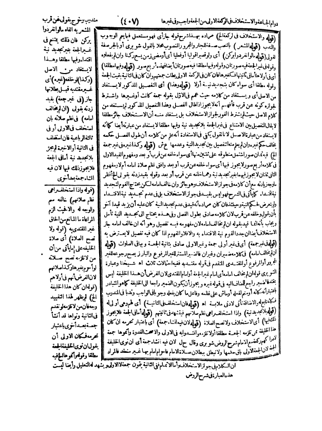 فِي دَوَامِ الْجَمَاعَةِ وَالِاسْتِخْلَافُ فِي الرَّكْعَةِ الْأُولَى مِنْ الْجُمُعَةِ وَاجِبٌ وَفِي غَيْرِهَا مَنْدُوبٌ وَخَرَجَ بِقَوْلِي عَنْ قُرْبٍ الْمُشْعِرِ بِهِ الْفَاءُ مَا لَوْ انْفَرَدُوا بِرُكْنٍ فَإِنَّ ذَلِكَ يَمْتَنِعُ فِي غَيْرِ الْجُمُعَةِ بِغَيْرِ تَجْدِيدِ نِيَّةِ اقْتِدَاءٍ وَفِيهَا مُطْلَقًا وَهَذَا لَا يُسْتَفَادُ مِنْ الْأَصْلِ (وَكَذَا) لَوْ خَلَفَهُ (غَيْرُهُ) أَيْ غَيْرُ مُقْتَدٍ بِهِ قَبْلَ بُطْلَانِهَا جَازَ (فِي غَيْرِ جُمُعَةٍ) بِقَيْدٍ زِدْته بِقَوْلِي (إنْ لَمْ يُخَالِفَ إمَامَهُ) فِي نَظْمِ صَلَاتِهِ بِأَنْ اسْتَخْلَفَ فِي الْأُولَى أَوْ فِي ثَالِثَةِ الرُّبَاعِيَّةِ. فَإِنْ اسْتَخْلَفَ فِي الثَّانِيَةِ أَوْ الْأَخِيرَةِ لَمْ يَجُزْ بِلَا تَجْدِيدِ نِيَّةٍ أَمَّا فِي الْجُمُعَةِ فَلَا يَجُوزُ ذَلِكَ فِيهَا لِأَنَّ فِيهِ إنْشَاءَ جُمُعَةٍ بَعْدَ أُخْرَى