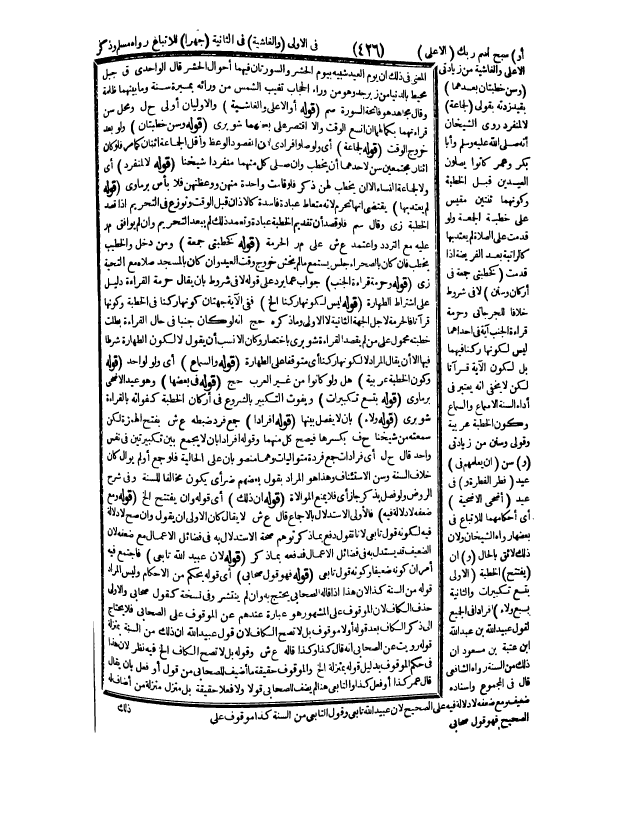 . (قَوْلُهُ: فِي بَعْضِهَا) وَهُوَ عِيدُ الْأَضْحَى بِرْمَاوِيٌّ (قَوْلُهُ: بِتِسْعِ تَكْبِيرَاتٍ) وَيَفُوتُ التَّكْبِيرُ بِالشُّرُوعِ فِي أَرْكَانِ الْخُطْبَةِ كَفَوَاتِهِ بِالْقِرَاءَةِ شَوْبَرِيٌّ (قَوْلُهُ: وِلَاءً) بِأَنْ يَفْصِلَ بَيْنَهَا (قَوْلُهُ أَفْرَادًا) جَمْعُ فَرْدٍ ضَبَطَهُ ع ش بِفَتْحِ الْهَمْزَةِ لَكِنْ سَمِعْتُهُ مِنْ شَيْخِنَا ح ف بِكَسْرِهَا فَيَصِحُّ كُلٌّ مِنْهُمَا وَقَوْلُهُ: أَفْرَادًا بِأَنْ لَا يَجْمَعَ بَيْنَ تَكْبِيرَتَيْنِ فِي نَفَسٍ وَاحِدٍ قَالَ ح ل أَيْ فَرْدَاتٍ جَمْعِ فَرْدَةٍ مُتَوَالِيَاتٍ وَهُمَا مَنْصُوبَانِ عَلَى الْحَالِيَّةِ فَلَوْ جَمَعَ أَوْ لَمْ يُوَالِ كَانَ خِلَافَ السُّنَّةِ. وَسُنَّ الِاسْتِئْنَافُ، وَهَذَا هُوَ الْمُرَادُ بِقَوْلِ بَعْضِهِمْ ضَرَّ أَيْ يَكُونُ مُخَالِفًا لِلسُّنَّةِ وَفِي شَرْحِ الرَّوْضِ وَلَوْ فَصَلَ بِذِكْرٍ جَازَ أَيْ فَلَا يَمْنَعُ الْمُوَالَاةَ (قَوْلُهُ: إنَّ ذَلِكَ) أَيْ قَوْلَهُ وَأَنْ يَفْتَتِحَ إلَخْ (قَوْلُهُ: وَمَعَ ضَعْفِهِ لَا دَلَالَةَ فِيهِ) فَالْأَوْلَى الِاسْتِدْلَال بِالْإِجْمَاعِ قَالَ ع ش: لَا يُقَالُ كَانَ الْأَوْلَى أَنْ يَقُولَ وَإِنْ صَحَّ لَا دَلَالَةَ فِيهِ لِكَوْنِهِ قَوْلَ تَابِعِيٍّ لِأَنَّا نَقُولُ دَفَعَ بِمَا ذَكَرَ تَوَهُّمَ صِحَّةِ الِاسْتِدْلَالِ بِهِ فِي فَضَائِلِ الْأَعْمَالِ مَعَ ضَعْفِهِ لِأَنَّ الضَّعِيفَ قَدْ يُسْتَدَلُّ بِهِ فِي فَضَائِلِ الْأَعْمَالِ فَدَفَعَهُ بِمَا ذُكِرَ (قَوْلُهُ: لِأَنَّ عُبَيْدَ اللَّهِ تَابِعِيٌّ) فَاجْتَمَعَ فِيهِ أَمْرَانِ كَوْنُهُ ضَعِيفًا وَكَوْنُهُ قَوْلَ تَابِعِيٍّ (قَوْلُهُ: فَهُوَ قَوْلُ صَحَابِيِّ) أَيْ قَوْلُهُ: بِحُكْمٍ مِنْ الْأَحْكَامِ وَلَيْسَ الْمُرَادُ قَوْلَهُ مِنْ السُّنَّةِ كَذَا؛ لِأَنَّ هَذَا إذَا قَالَهُ الصَّحَابِيُّ يُحْتَجُّ بِهِ وَإِنْ لَمْ يَنْتَشِرْ وَفِي نُسْخَةٍ كَقَوْلِ صَحَابِيٍّ وَالْأَوْلَى حَذْفُ الْكَافِ لِأَنَّ الْمَوْقُوفَ عَلَى الْمَشْهُورِ هُوَ عِبَارَةٌ عِنْدَهُمْ عَنْ الْمَوْقُوفِ عَلَى الصَّحَابِيِّ فَلَا يُحْتَاجُ إلَى ذِكْرِ الْكَافِ بَعْدَ قَوْلِهِ أَوَّلًا مَوْقُوفٌ بَلْ لَا تَصِحُّ الْكَافُ؛ لِأَنَّ قَوْلَ عُبَيْدِ اللَّهِ إنَّ ذَلِكَ مِنْ السُّنَّةِ بِمَنْزِلَةِ قَوْلِهِ رَوَيْت عَنْ الصَّحَابِيِّ أَنَّهُ قَالَ كَذَا وَكَذَا قَالَهُ ع ش.