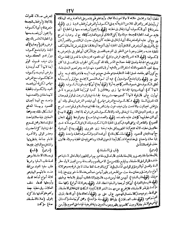 (دَرْسٌ) (بَابٌ) فِي الِاسْتِسْقَاءِ وَهُوَ لُغَةً طَلَبُ السُّقْيَا وَشَرْعًا طَلَبُ سُقْيَا الْعِبَادِ مِنْ اللَّهِ عِنْدَ حَاجَتِهِمْ إلَيْهَا.