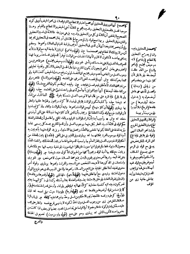 كَمَا صَحَّحَهُ فِي التَّحْقِيقِ وَغَيْرِهِ وَإِنْ لَمْ يُصَرِّحْ فِي التَّحْقِيقِ بِالِانْقِطَاعِ. (وَنِفَاسٌ) لِأَنَّهُ دَمُ حَيْضٍ مُجْتَمِعٌ. (وَنَحْوُ وِلَادَةٍ) مِنْ إلْقَاءِ عَلَقَةٍ، أَوْ مُضْغَةٍ وَلَوْ بِلَا بَلَلٍ لِأَنَّ كُلًّا مِنْهُمَا مَنِيٌّ مُنْعَقِدٌ وَنَحْوُ مِنْ زِيَادَتِي.