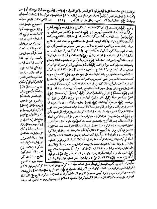 (قَوْلُهُ: إنَّ اللَّهَ لَا يَسْتَحْيِ مِنْ الْحَقِّ) يُحْتَمَلُ أَنَّهُ لَا يَأْمُرُ أَنْ يُسْتَحْيَا مِنْ الْحَقِّ، أَوْ لَا يَمْتَنِعُ مِنْ ذِكْرِهِ امْتِنَاعَ الْمُسْتَحِي وَإِنَّمَا قَدَّمَتْ ذَلِكَ عَلَى سُؤَالِهَا لِلْإِشَارَةِ إلَى أَنَّ الْمَسْئُولَ أَمْرٌ يُسْتَحْيَا مِنْهُ فَهُوَ نَوْعُ بَرَاعَةِ اسْتِهْلَالٍ عِنْدَ أَهْلِ الْبَدِيعِ شَوْبَرِيٌّ. (قَوْلُهُ: كَالْمَعِدَةِ) صَوَابُهُ كَتَحْتِ الْمَعِدَةِ إذْ الْخَارِجُ مِنْ نَفْسِ الصُّلْبِ يُوجِبُ الْغُسْلَ لِأَنَّهُ مَعْدِنُ الْمَنِيِّ س ل. (قَوْلُهُ: ثُمَّ الْكَلَامُ) أَيْ فِي قَوْلِهِ، أَوْ تَحْتَ صُلْبٍ إلَخْ، وَأَمَّا إذَا كَانَ مِنْ طَرِيقِهِ الْمُعْتَادِ، فَلَا يَتَقَيَّدُ بِكَوْنِهِ مُسْتَحْكِمًا فَيَجِبُ بِهِ الْغُسْلُ، وَإِنْ خَرَجَ لِمَرَضٍ وَلَوْ عَلَى صُورَةِ الدَّمِ لِكَثْرَةِ الْجِمَاعِ وَنَحْوِهِ فَيَكُونُ طَاهِرًا مُوجِبًا لِلْغُسْلِ كَمَا فِي ر م. (قَوْلُهُ: مُسْتَحْكَمٍ) أَيْ خَرَجَ لَا لِعِلَّةٍ وَلَا مَرَضٍ. (قَوْلُهُ: أَوْ لَذَّةٍ إلَخْ) أَوْ مَانِعَةُ خُلُوٍّ. (قَوْلُهُ: عَجِينٍ) أَيْ لِنَحْوِ حِنْطَةٍ. (قَوْلُهُ: بَيَاضِ بِيضٍ) أَيْ لِنَحْوِ دَجَاجٍ شَوْبَرِيٌّ. (قَوْلُهُ: مِنْ الْمَنِيِّ) أَيْ مِنْ ضَمِيرِهِ. (قَوْلُهُ: خَوَاصُّهُ) أَيْ عَلَامَاتُهُ. (قَوْلُهُ: يَجِبُ) وَهَلْ يُسَنُّ، أَوْ لَا شَوْبَرِيٌّ وَنُقِلَ عَنْ ز ي أَنَّهُ لَا يُنْدَبُ، بَلْ يَحْرُمُ. قُلْت وَهُوَ ظَاهِرٌ إذَا لَمْ يَحْصُلْ شَكٌّ لِأَنَّهُ الْآنَ مُتَعَاطٍ عِبَادَةً فَاسِدَةً فَإِنْ حَصَلَ شَكٌّ فَهِيَ مَسْأَلَةُ التَّخْيِيرِ الْآتِيَةِ خُصُوصًا وَقَدْ حَكَمُوا عَلَيْهِ فِي الْحَالَةِ الْمَذْكُورَةِ بِأَنَّهُ لَيْسَ بِمَنِيٍّ فَمِنْ أَيْنَ تَأْتِي السُّنِّيَّةُ تَأَمَّلْ اج.