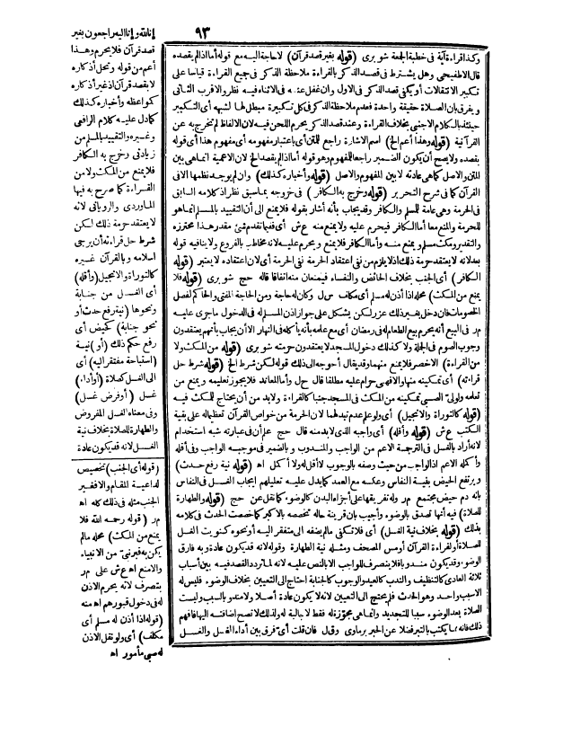 {إِنَّا لِلَّهِ وَإِنَّا إِلَيْهِ رَاجِعُونَ} [البقرة: 156] بِغَيْرِ قَصْدِ قُرْآنٍ فَلَا تَحْرُمُ وَهَذَا أَعَمُّ مِنْ قَوْلِهِ وَتَحِلُّ أَذْكَارُهُ لَا بِقَصْدِ قُرْآنٍ إذْ غَيْرُ أَذْكَارِهِ كَمَوَاعِظِهِ، وَأَخْبَارِهِ كَذَلِكَ كَمَا دَلَّ عَلَيْهِ كَلَامُ الرَّافِعِيِّ وَغَيْرِهِ وَالتَّقْيِيدُ بِالْمُسْلِمِ مِنْ زِيَادَتِي وَخَرَجَ بِهِ الْكَافِرُ فَلَا يُمْنَعُ مِنْ الْمُكْثِ وَلَا مِنْ الْقِرَاءَةِ كَمَا صَرَّحَ بِهِ فِيهَا الْمَاوَرْدِيُّ وَالرُّويَانِيُّ لِأَنَّهُ لَا يَعْتَقِدُ حُرْمَةَ ذَلِكَ لَكِنْ شَرْطُ حِلِّ قِرَاءَتِهِ أَنْ يُرْجَى إسْلَامُهُ وَبِالْقُرْآنِ غَيْرُهُ كَالتَّوْرَاةِ وَالْإِنْجِيلِ