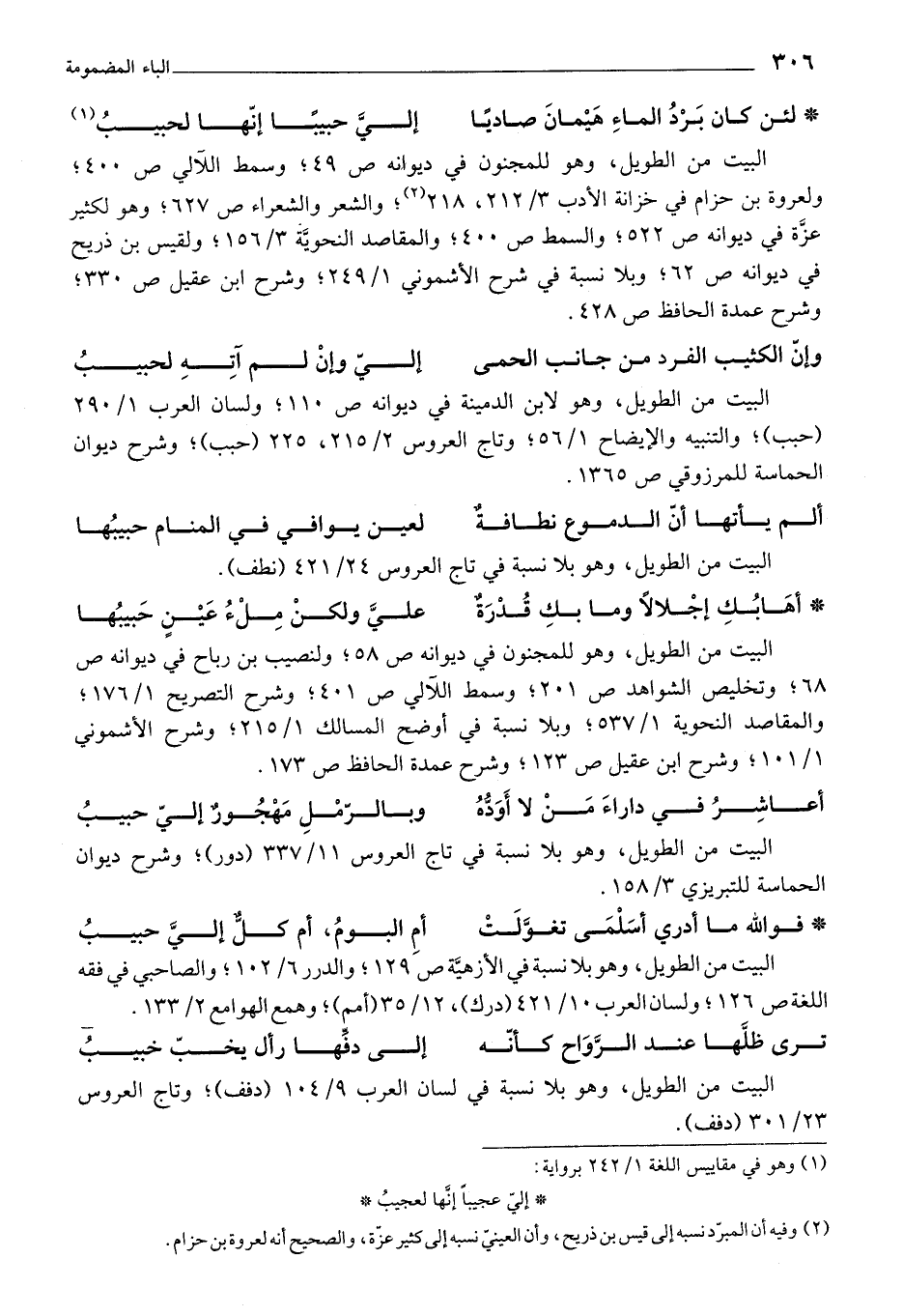 (¬2) وفيه أن المبرد نسبه إلى قيس بن ذريح، وأن العيني نسبه إلى كثير عزة، والصحيح أنه لعروة بن حزام.