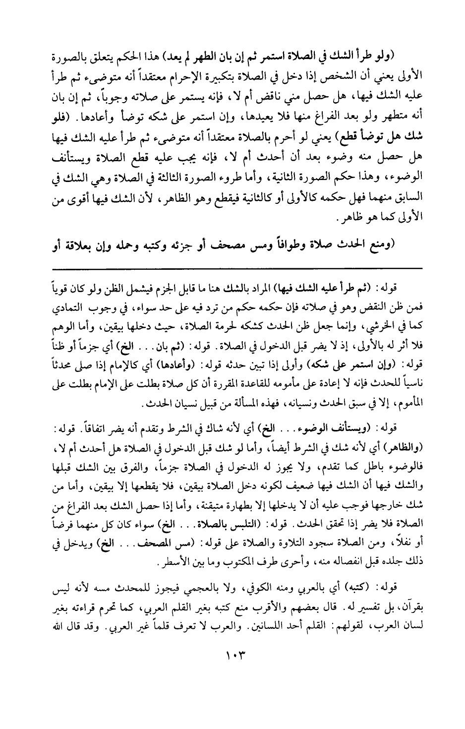 قوله : 16 ( وهو الظاهر ) : أى لأنه شك فى الشرط أيضا ، وأما لو شك قبل الدخول فى الصلاة هل أحدث أم لا ؟ فالوضوء باطل كما تقدم ، ولا يجوز له الدخول فى الصلاة جزما . والفرق بين الشك قبلها ، أن الشك فيها ضعيف لكونه دخل الصلاة بيقين فلا يقطعها إلا بيقين . وأما من شك خارجها فواجب عليه أن لا يدخلها إلا بطهارة متيقنة ، وأما إذا حصل الشك بعد الفراغ من الصلاة فلا يضر إلا إذا تحقق الحدث .
