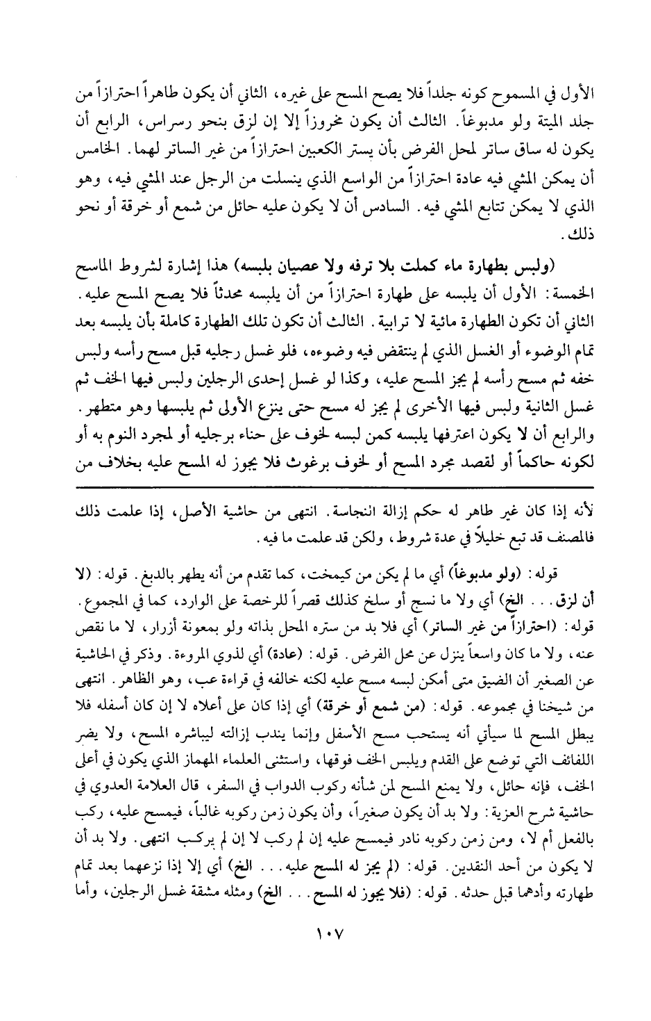 قوله : 16 ( من شمع أو خرقة ) : أى إذا كان على أعلاه لا إن كان أسفله ، فلا يبطل المسح لما سيأتى أنه يستحب مسح الأسفل ، وإنما يندب إزالته ليباشره المسح . ولا تضر اللفائف التى توضع على القدم ويلبس الخف فوقها . واستثنى العلماء المهماز الذى يكون فى أعلى الخف . فإنه حائل ولا يمنع المسح لمن شأنه ركوب الدواب فى السفر . قال العلامة العدوى فى حاشية شرج العزية : ولا بد أن يكون صغيرا وأن يكون زمن ركوبه غالبا فيمسح عليه ركب بالفعل أم لا . ومن زمن ركوبه نادر فيمسح عليه إن ركب لا إن لم يركب . ( انتهى ) . ولا بد أن يكون من أحد النقدين .