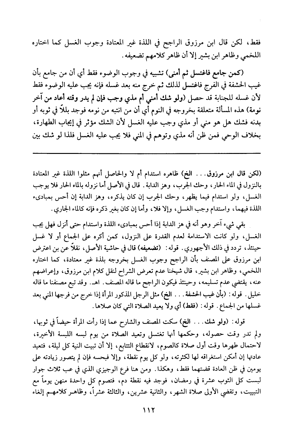 16 ( لكن قال ابن مرزوق ) إلخ : ظاهره استدام أم لا . والحاصل أنهم مثلوا اللذة غير المعتادة بالنزول فى الماء الحار وحك الجرب وهز الدابة . قال فى الأصل : أما نزوله بالماء الحار فلا يوجب الغسل ولو استدام فيما يظهر ، وحك الجرب إن كان بذكره ، وهز الدابة إن أحس بمبادىء اللذة فيهما واستدام وجب الغسل وإلا فلا . وأما إن كان بغير ذكره فإنه كالماء الحار . بقى شىء ؛ وهو أنه فى هز الدابة إذا أحس بمبادىء اللذة واستدام حتى أنزل فهل يجب الغسل ولو كانت الاستدامة لعدم القدرة على النزول كمن أكره على الجماع ؟ أو لا غسل حينئذ ؟ تردد فى ذلك الأجهورى .
