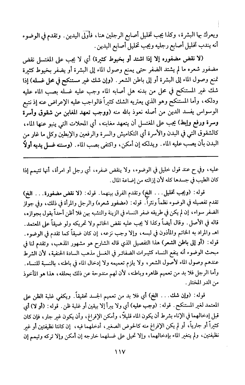 قوله : 16 ( مضفور شعره ) : والرجل والمرأة فى ذلك وفى جواز الضفر سواء ، إن لم يكن على طريقة ضفر النساء فى الزينة والتشبه بهن ، فلا أظن أحدا يقول بجوازه ، قاله فى الأصل ، وقال أيضا : وكذا لا يجب عليه نقض الخاتم ولا تحريكه ولو ضيقا على المعتمد ( ا هـ ) والمراد به الخاتم المأذون في لبسه وإلا وجب نزعه إن كان ضيقا كما تقدم فى الوضوء .