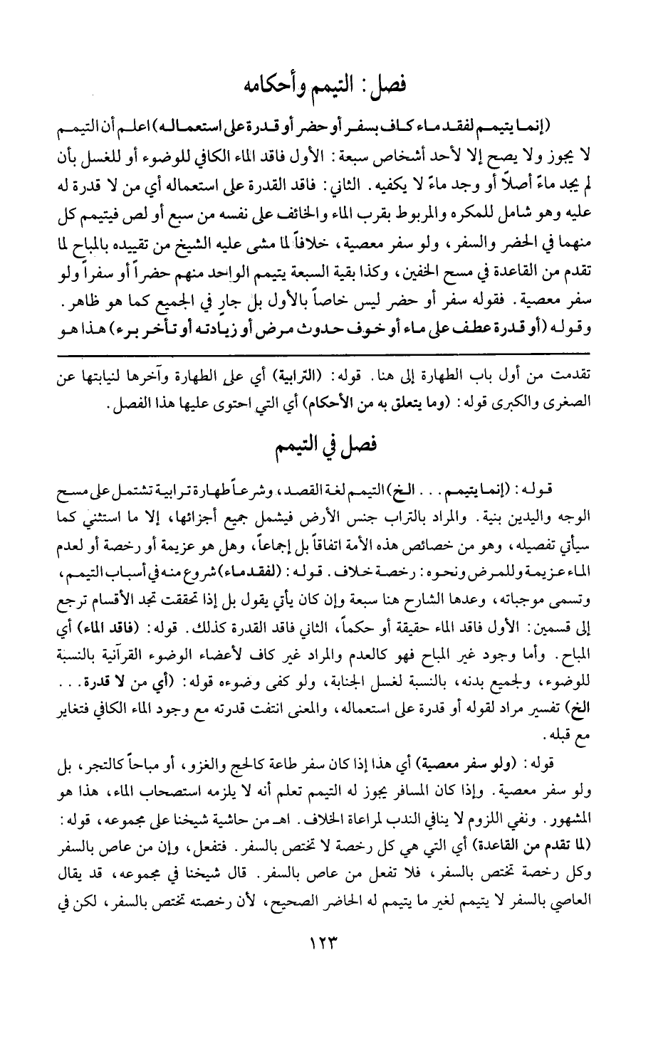 قوله : 16 ( لفقد ماء ) : شروع منه فى أسباب التيمم ، وتسمى موجباته وعدها الشارح هنا سبعة . وإن كان يأتى يقول : بل إذا تحققت تجد الأقسام ترجع إلى قسمين : الأول فاقد الماء حقيقة أو حكما ، الثانى فاقد القدرة كذلك .