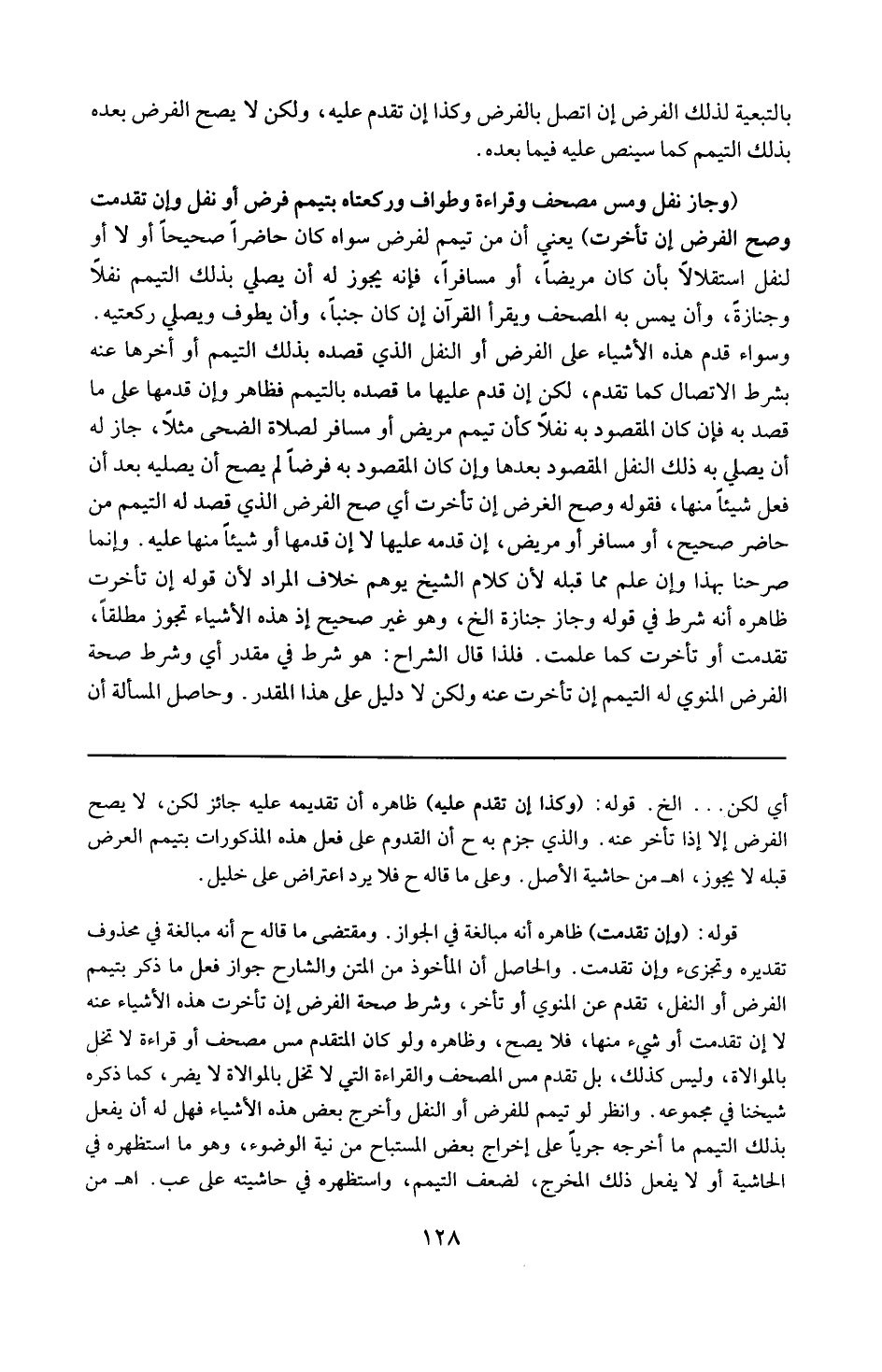 قوله : 16 ( وإن تقدمت ) : ظاهره أنه مبالغة فى الجواز ، ومقتضى ما قاله ( ح ) أنه مبالغة فى محذوف تقديره وتجزىء وإن تقدمت . والحاصل أن المأخوذ من المتن والشارح ، جواز فعل ما ذكر بتيمم الفرض أو النفل تقدم عن المنوىّ أو تأخر . وشرط صحة الفرض إن تأخرت هذه الأشياء عنه لا إن تقدمت أو شىء منها ، فلا يصح . وظاهره ولو كان المتقدم مس مصحف أو قراءة ، لا تخل بالموالاة ، وليس كذلك بل تقدم مس الصحف والقراءة التي لا تخل بالموالاة لا يضر ، كما ذكره شيخنا فى مجموعه . وانظر لو تيمم للفرض أو النفل وأخرج بعض هذه الأشياء فهل له أن يفعل بذلك التيمم ماأخرجه جريا على إخراج بعض المستباح من نية الوضوء ؟ وهو ما استظهره فى الحاشية ، أو لايفعل ذلك المخرج لضعف التيمم ؟ واستظهره فى حاشيته على ( عب ) ( ا هـ . من