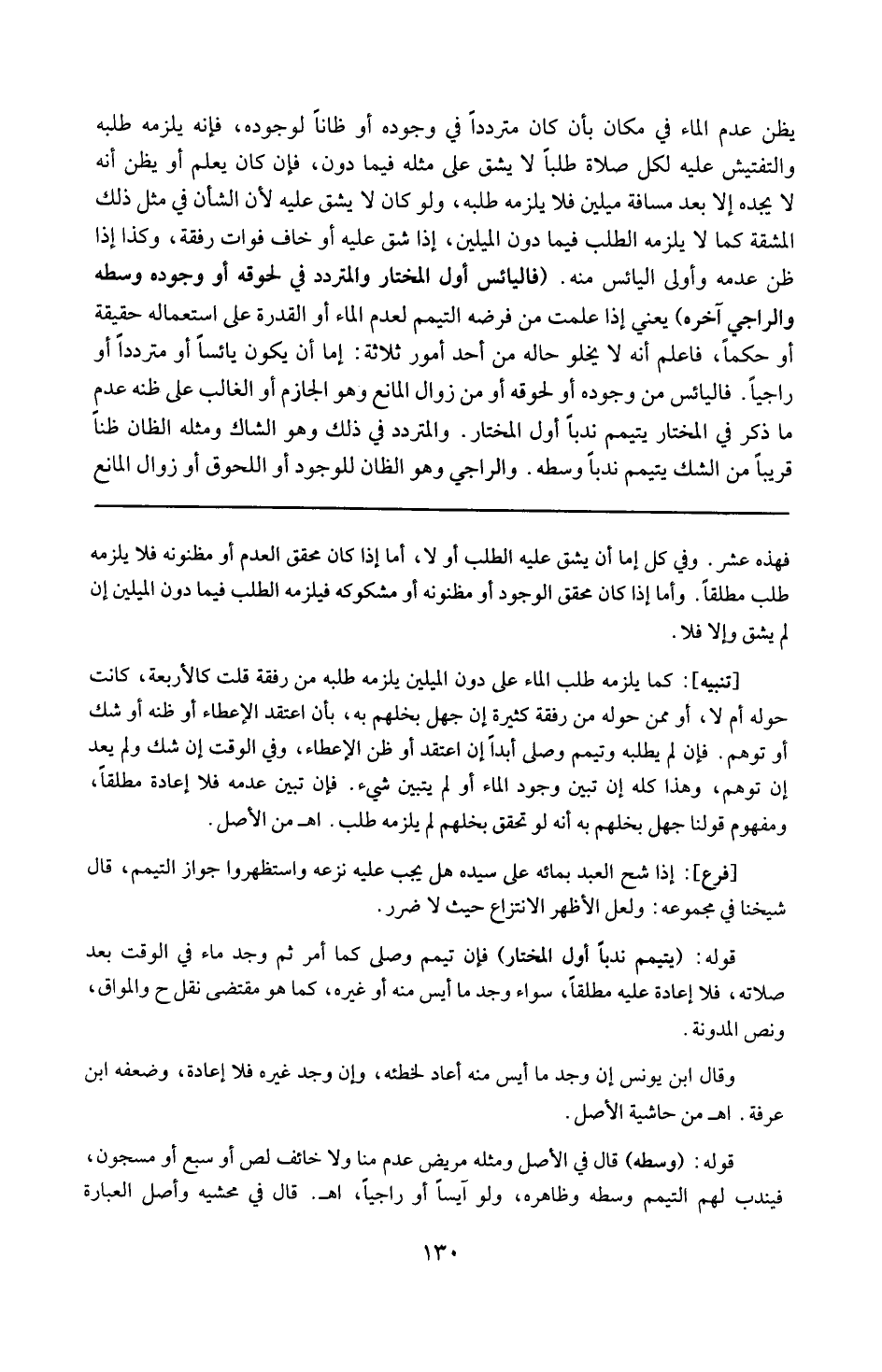 فهذه عشر . وفى كل : إما أن يشق عليه الطلب ، أو لا . أما إذا كان محقق العدم أو مظنونه فلا يلزمه طلب مطلقا . وأما إذا كان محقق الوجود أو مظنونه أو مشكوكه فيلزمه الطلب فيما دون الميلين إن لم يشق عليه وإلا فلا .