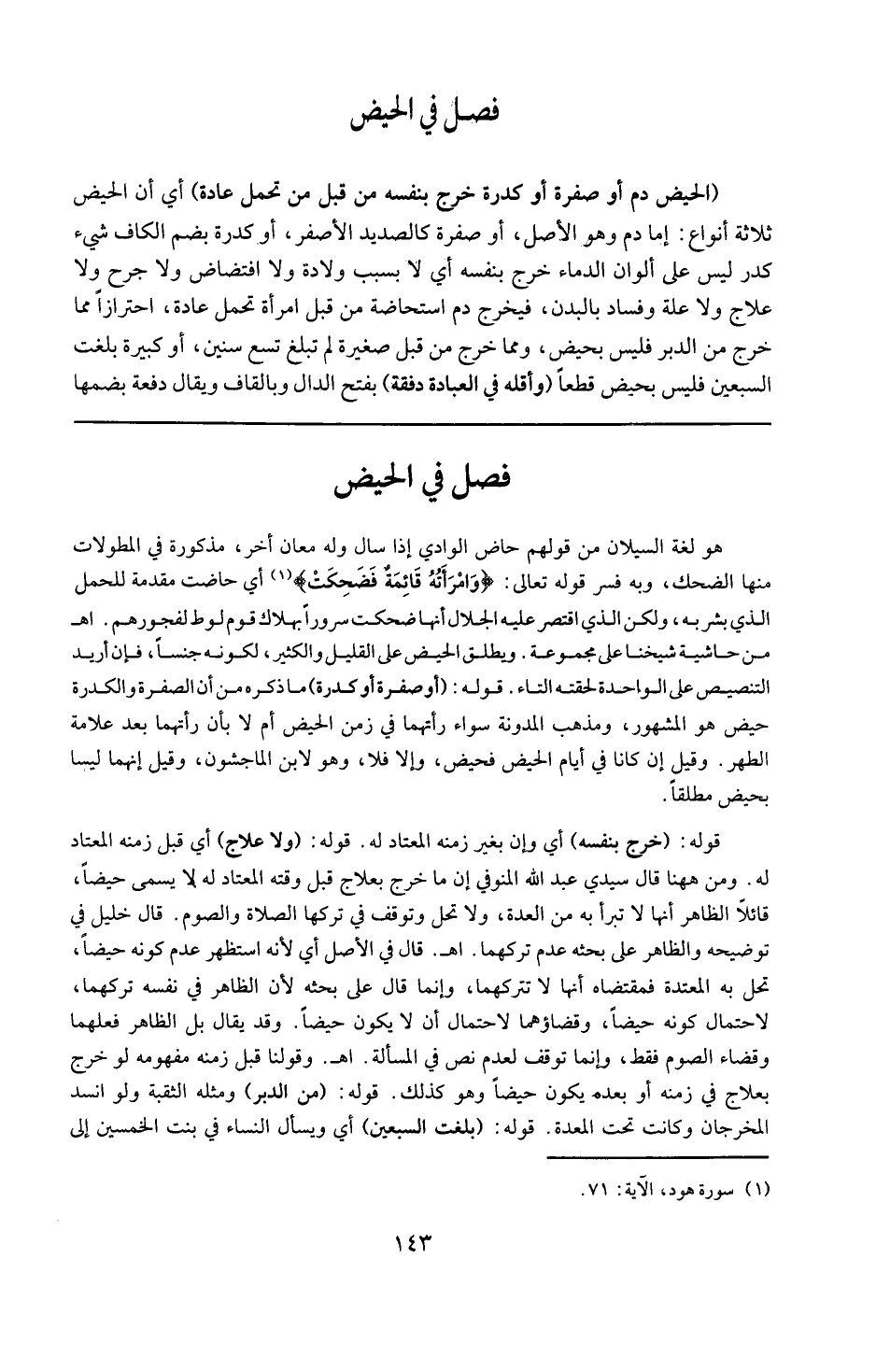 هو لغة : السيلان ، من قولهم حاض الوادي إذا سال ، وله معان أخرى مذكورة فى المطولات منها الضحك ، وبه فسر قوله تعالى : { وامرأته قائمة فضحكت } أي حاضت مقدمة للحمل الذى بشر به ، ولكن الذى اقتصر عليه الجلال أنها ضحكت سروراً بهلاك قوم لوط لفجورهم . ( ا هـ من حاشية شيخنا على مجموعه ) . ويطلق الحيض على القليل والكثير لكونه جنسا ، فإن أريد التنصيص على الوحدة لحقته التاء .