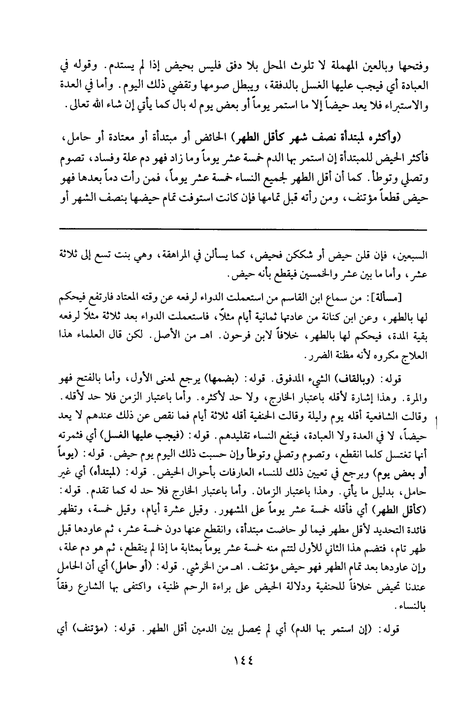 قوله : 6 ( بضمها ) : يرجع لمعنى الأول ، وأما بالفتح فهو المرة وهذا إشارة لأقله باعتبار الخارج ولا حدّ لأكثره ، وأما باعتبار الزمن فلا حد لأقله . وقالت الشافعية : أقله يوم وليلة . وقالت الحنفية : أقله ثلاثة أيام ، فما نقص عن ذلك عندهم لا يعد حيضا لا في العدة ولا في العبادة فينفع النساء تقليدهم .