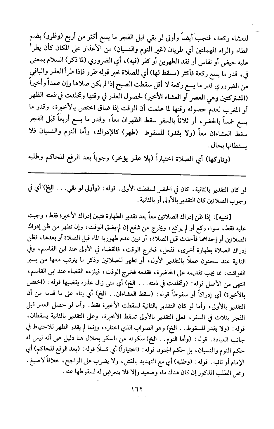 تنبيه : إذا ظن إدراك الصلاتين معاً بعد تقدير الطهارة ، فتبين إدراك الأخيرة فقط ، وجبت عليه فقط سواء ركع أو لم يركع . ويخرج عن شفع إن لم يضق الوقت . وإن تطهر من ظن إدراك الصلاتين أو إحدهما فأحدث قبل الصلاة ، أو تبين عدم طهورية الماء قبل الصلاة أو بعدها ، فظن إدراك الصلاة بطهارة أخرى ففعل فخرج الوقت ، فالقضاء في الأولى عند ابن القاسم وفي الثانية عند سحنون ، عملاً بالتقدير الأول . أو تطهر للصلاتين وذكر ما يترتب معها من يسير الفوائت مما يجب تقديمه على الحاضرة فقدمه فخرج الوقت فيلزمه القضاء عند ابن القاسم ( انتهى من الأصل ) .