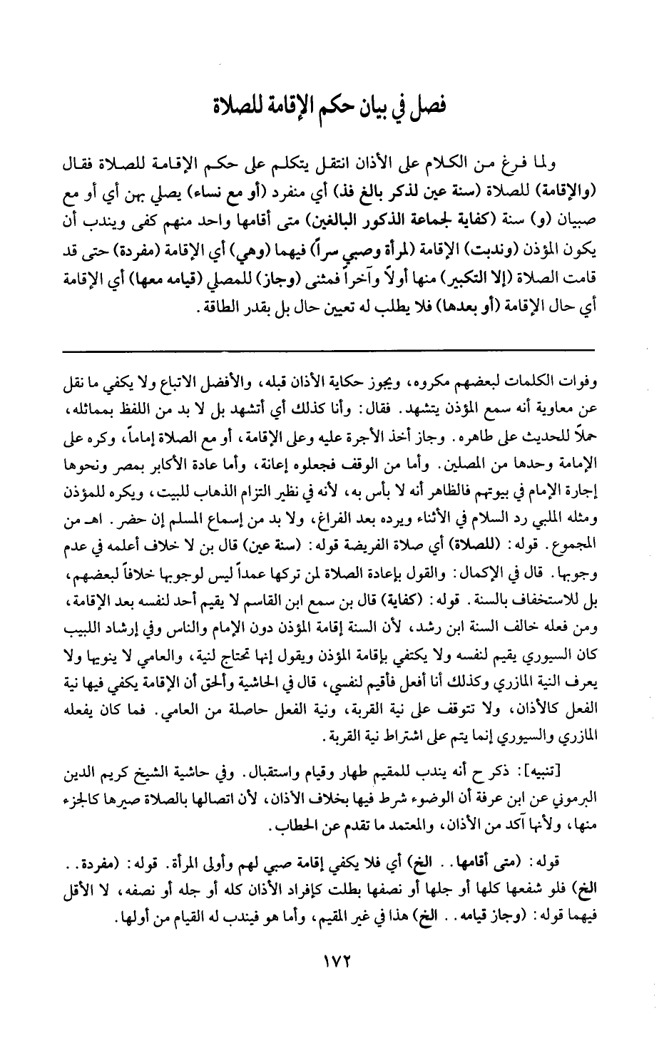 قوله : 16 ( كفاية ) : قال ( بن ) سمع ابن القاسم لا يقيم أحد لنفسه بعد الإقامة ومن فعله خالف السنة ، ابن رشد لأن السنة إقامة المؤذن دون الإمام والناس ، وفي إرشاد اللبيب : كان السيوري يقيم لنفسه ولا يكتفي بإقامة المؤذن ، ويقول : إنها تحتاج لنية والعامي لا ينويها ولا يعرف النية ، المازري وكذلك أنا أفعل فأقيم لنفسي . قال في الحاشية : والحق أن الإقامة يكفي فيها نية الفعل كالأذان ، ولا تتوقف على نية القربة ونية الفعل حاصلة من العامي فما كان يفعله المازري و السيوري إنما يتم على اشتراط نية القربة .
