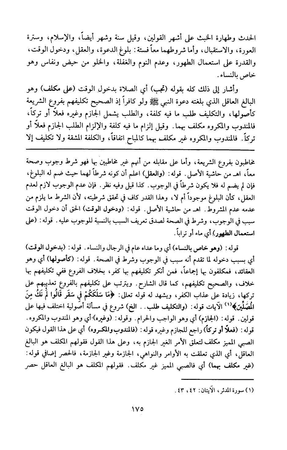 قوله : 16 ( والعقل ) : اعلم أن كونه شرطاً لهما حيث ضم له البلوغ ، فإن لم يضم له فلا يكون شرطاً في الوجوب كذا قيل ، وفيه نظر . فإن عدم الوجوب لازم لعدم العقل كان البلوغ موجوداً أم لا ، وهذا القدر كاف في تحقيق شرطيته لأن الشرط ما يلزم من عدمه عدم المشروط . ( 1 هـ من حاشية الأصل ) .